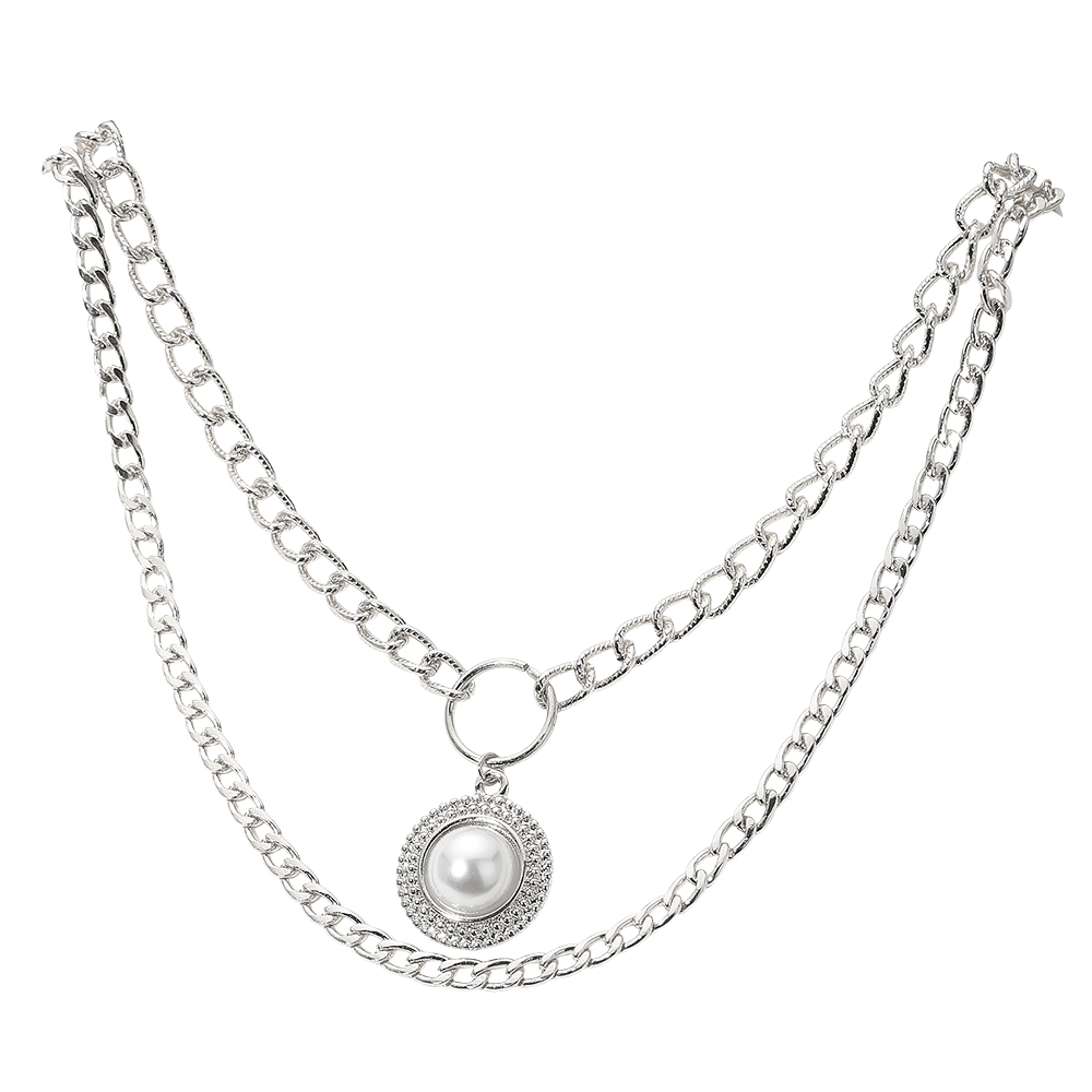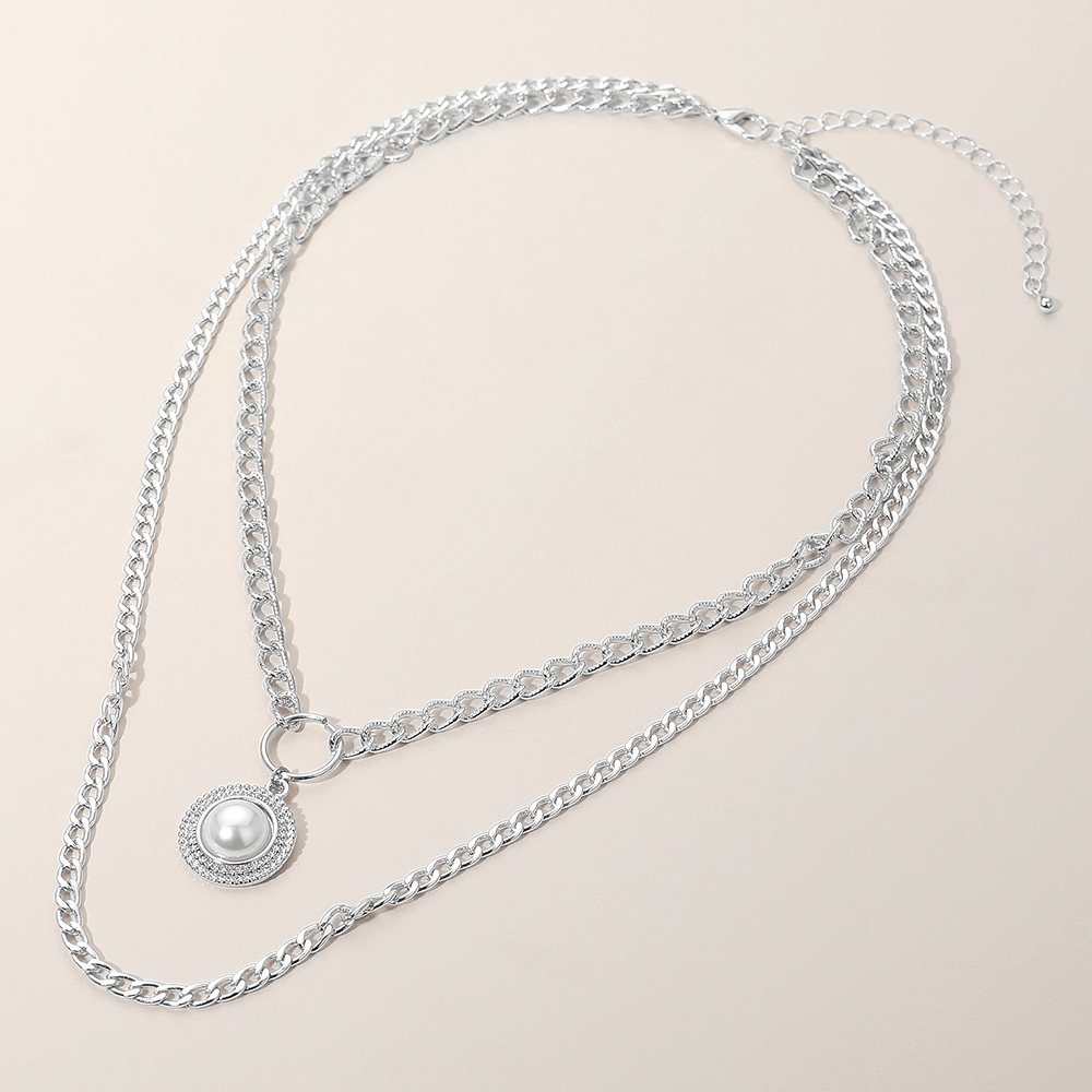 • Modern layered chain necklace featuring bold links and a pearl-inspired pendant framed with sparkling accents. A chic statement piece that blends elegance with trend-forward design, perfect for elevating everyday outfits or enhancing special occasion looks with timeless charm.