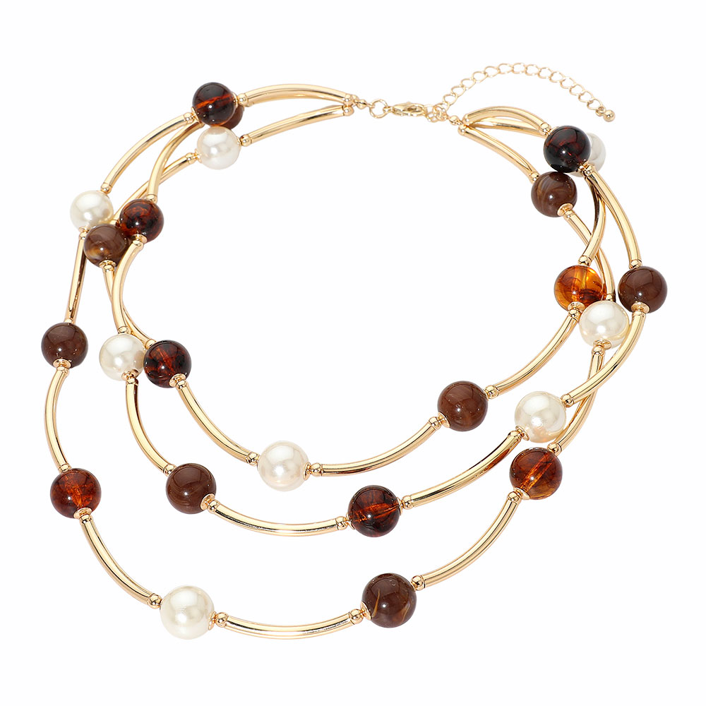 Details • Necklace Size : 17" + 3" L • Decor Size : 2" L • A refined multi-strand necklace featuring smooth curved bars and a blend of polished beads for a balanced, sophisticated look. Its layered silhouette creates effortless dimension, making it an ideal statement piece for elevating both casual and dressy outfits. • Lead and Nickel Compliant