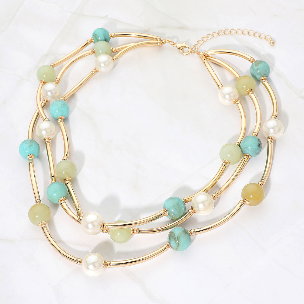 Resin Ball Pearl Metal Bar Beaded Double Strand Necklace