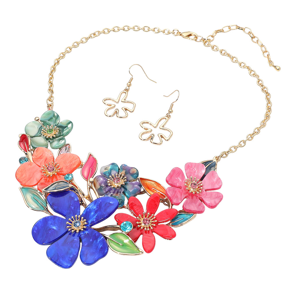 Details • Necklace Size : 18" + 3" L • Decor Size : 2.9" L • Earrings Size : 1.75" L • This floral statement necklace and earring set showcases beautifully layered petals and delicate leaf accents, creating a bold yet elegant look. Perfect for special occasions or evening events, this coordinated set adds a sophisticated, feminine charm that enhances any ensemble. • Lead and Nickel Compliant