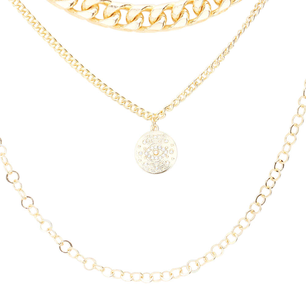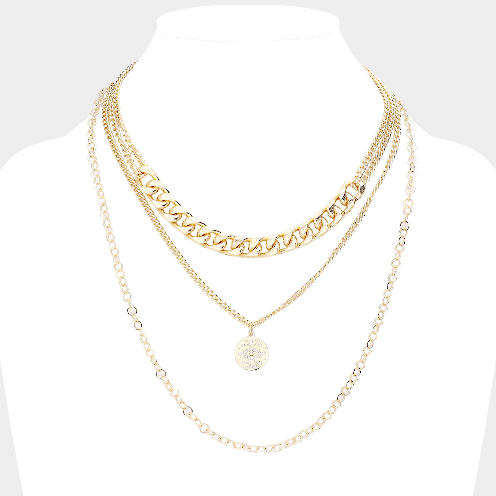 Rhinestone Embellished Evil Eye Metal Disc Pendant Triple Layered Necklace