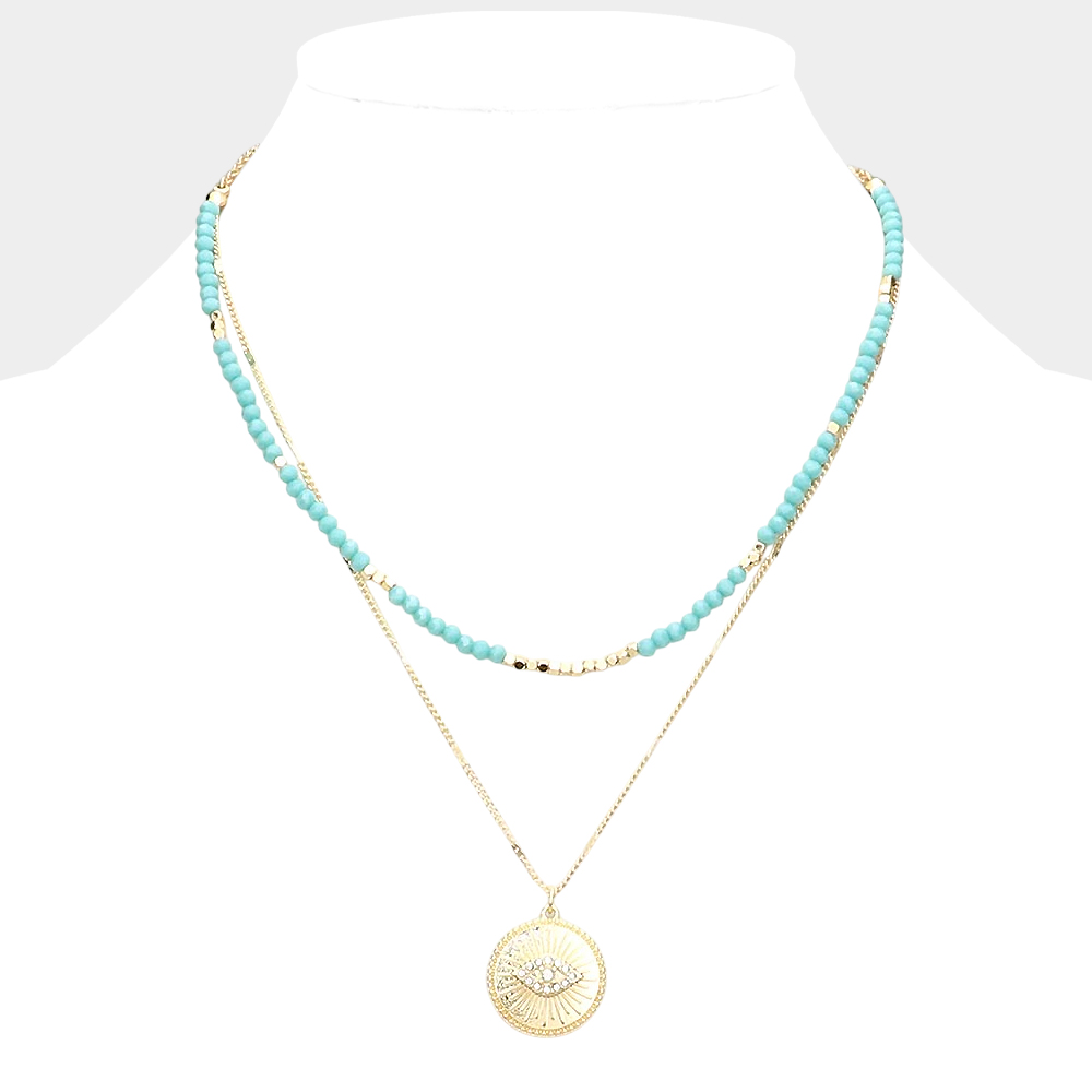 Evil Eye Accented Rhinestone Embellished Round Pendant Beaded Necklace