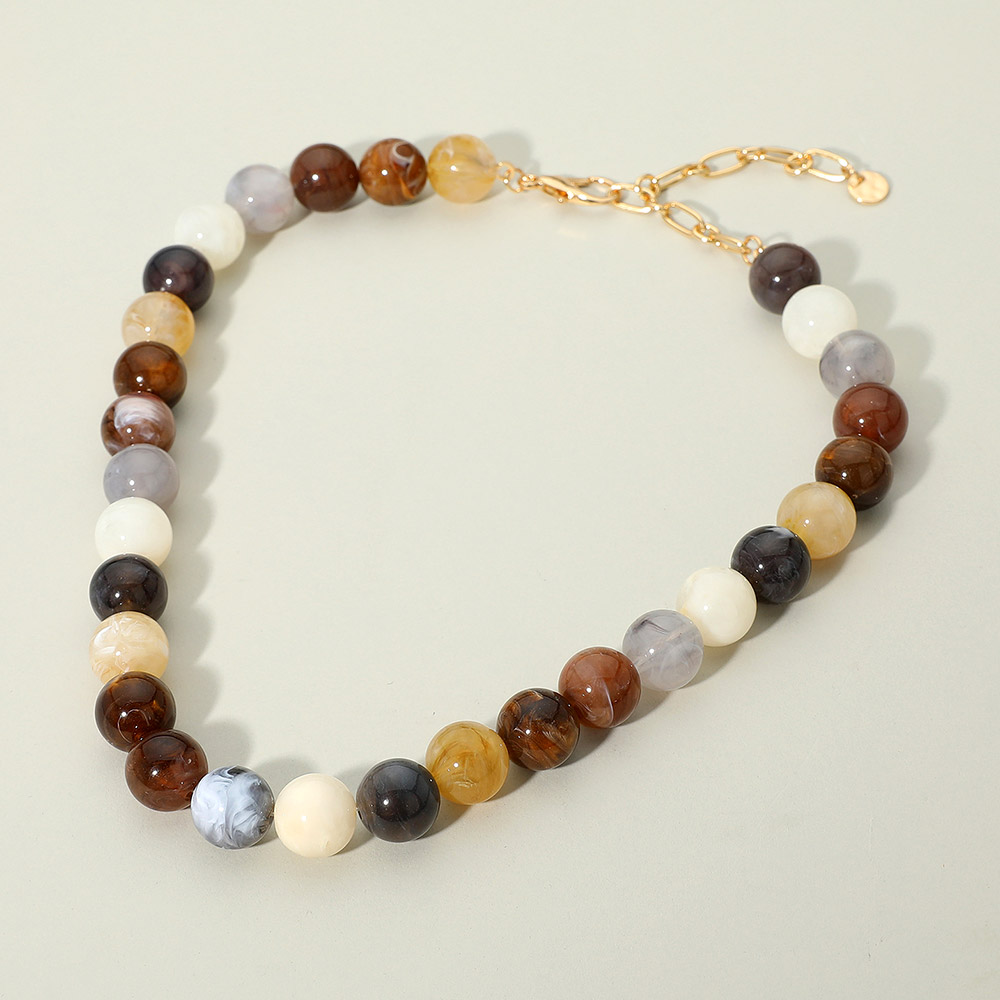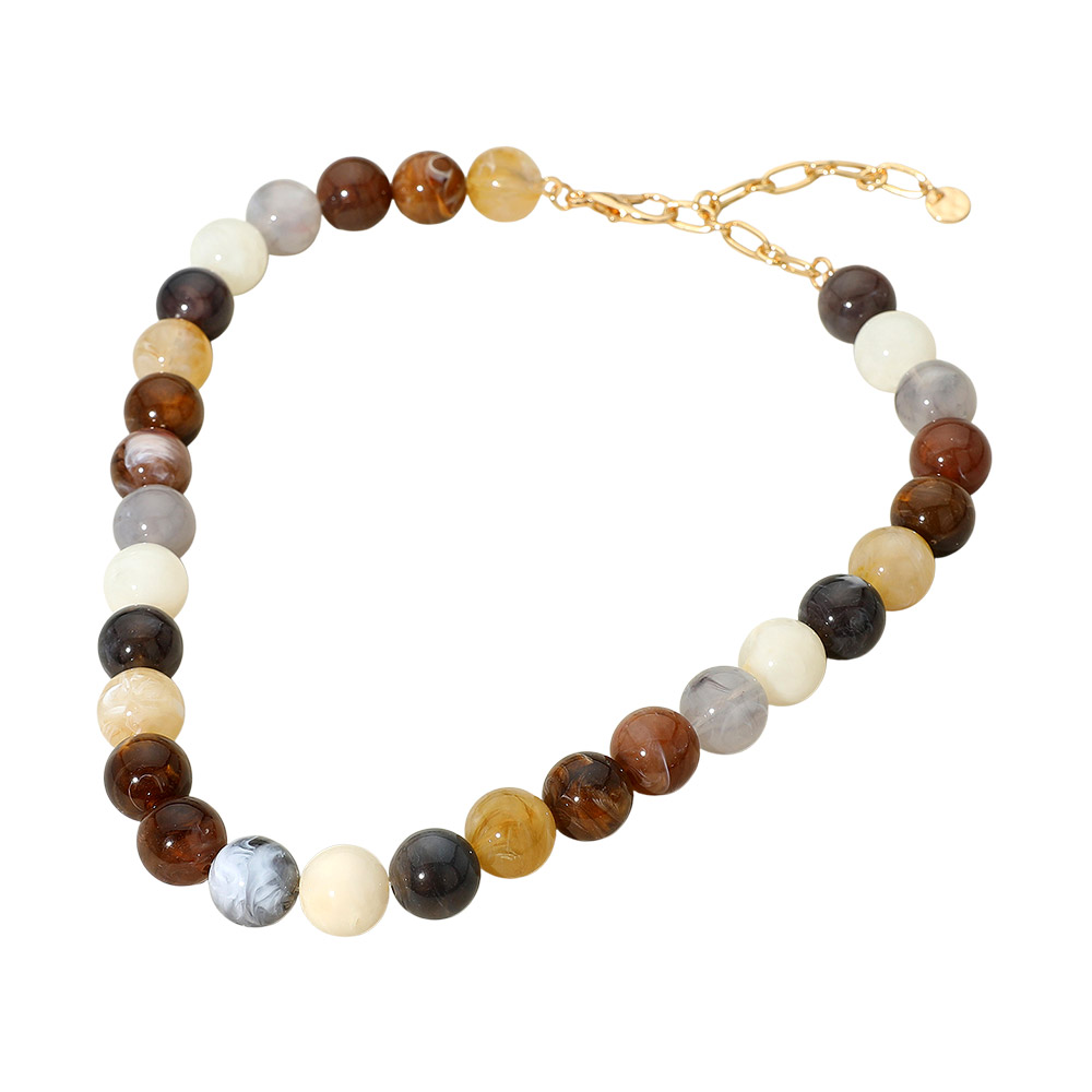 Details • Necklace Size : 17" + 3" L • Decor Size : 0.5" L • Add a touch of earthy elegance with this 17.5" round beaded necklace. Featuring polished natural stones in a variety of tones, each bead showcases unique patterns and depth. Finished with a secure clasp and extender, this versatile piece is perfect for layering or wearing solo. • Lead and Nickel Compliant