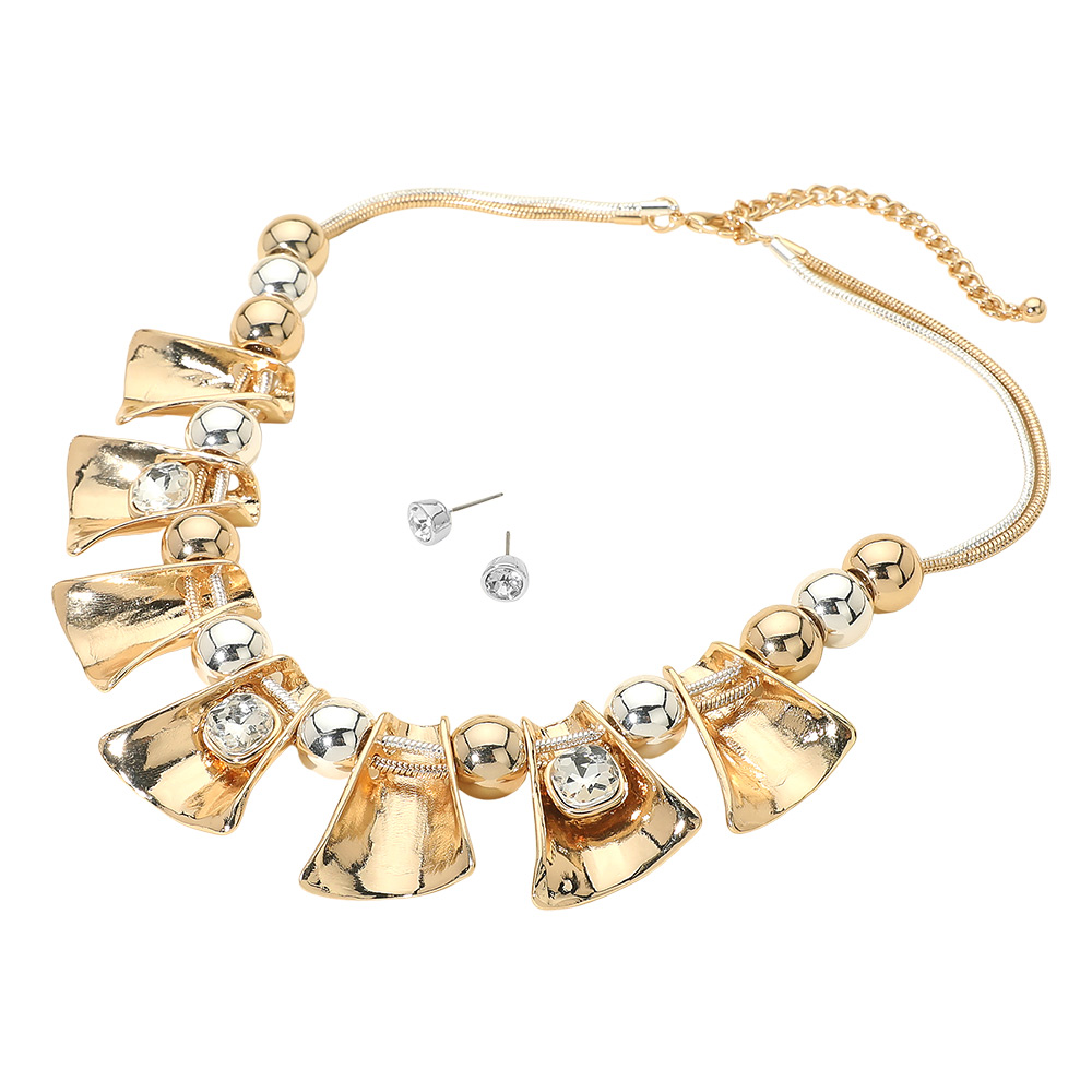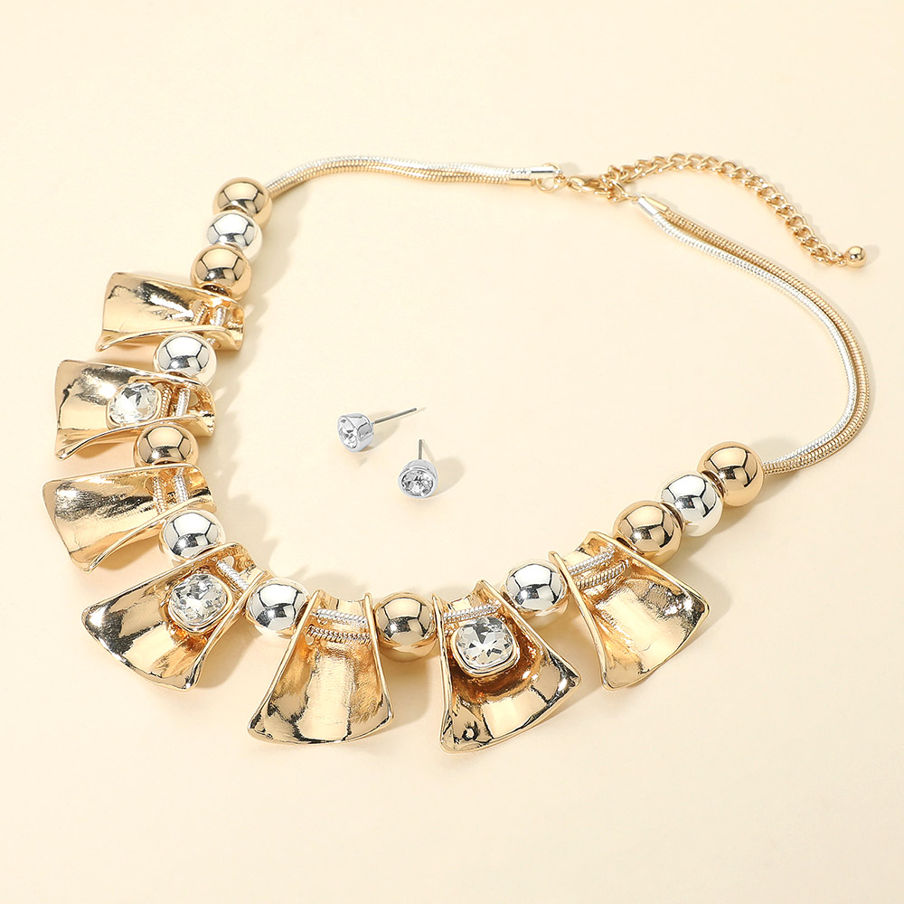 • Statement necklace and stud earring set designed with bold sculpted accents, rounded bead detailing, and radiant stone highlights for a dramatic, fashion-forward look. Perfect for elevating dresses, evening wear, or special occasion outfits. A standout accessory ideal for gifting or curated boutique jewelry collections.