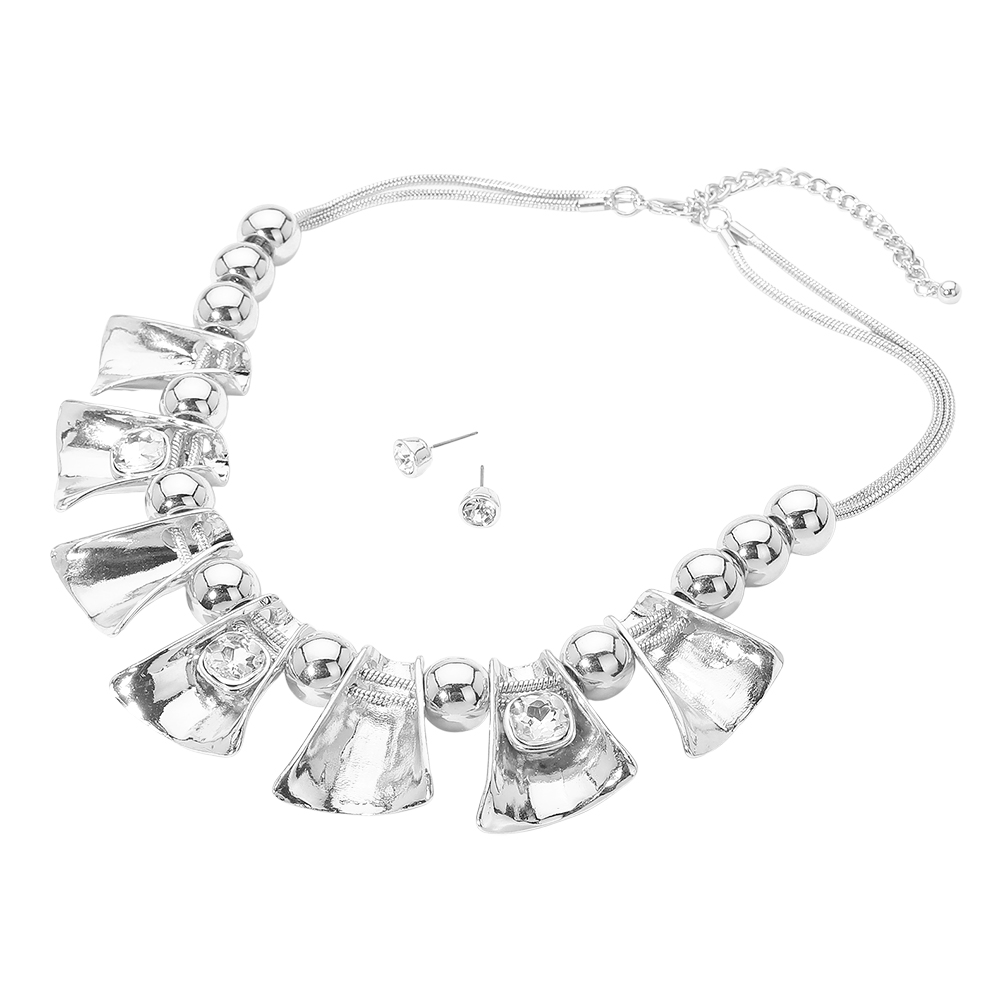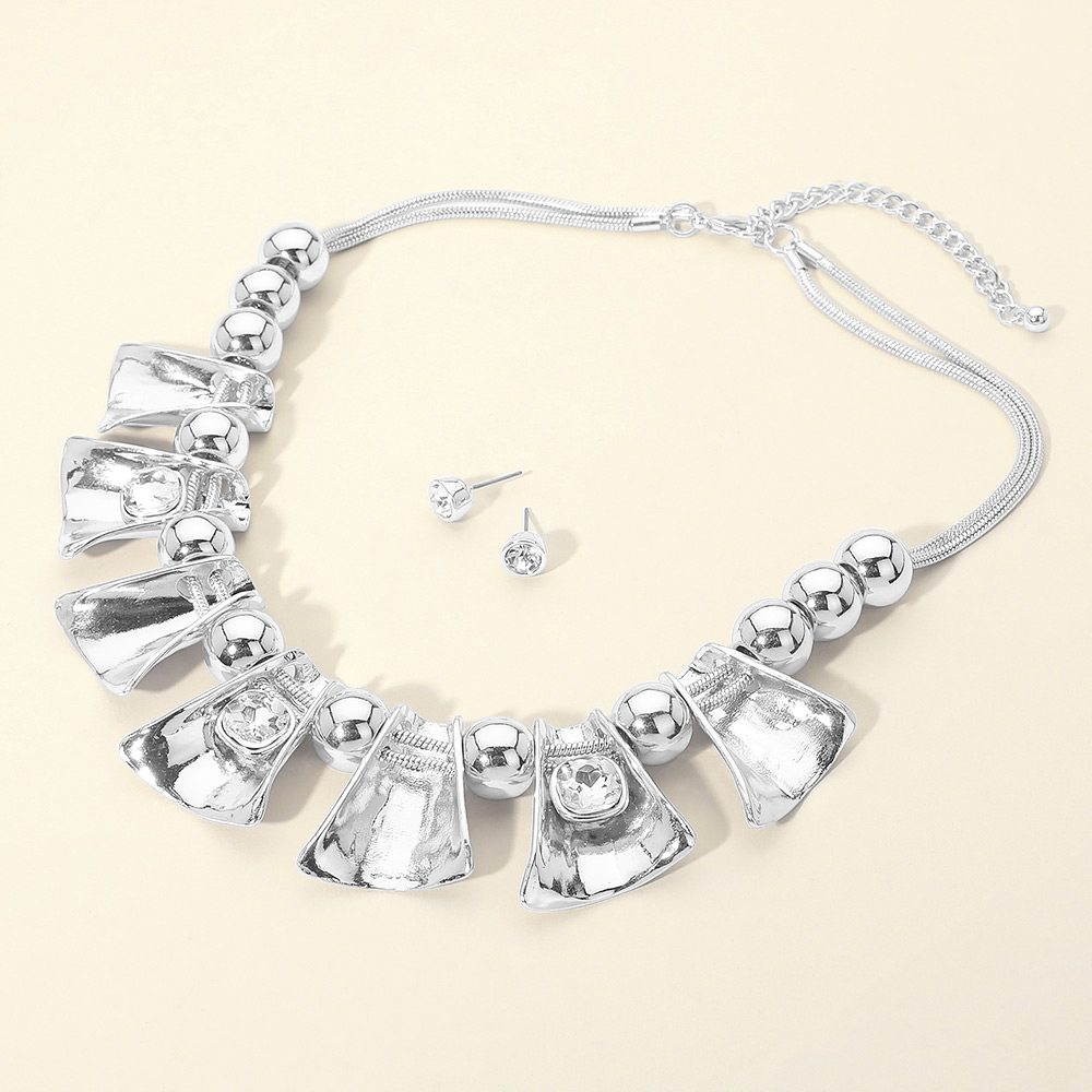 Details • Necklace Size : 18" + 3.25" L • Decor Size : 1.25" L • Earrings Size : 0.3" L • Statement necklace and stud earring set designed with bold sculpted accents, rounded bead detailing, and radiant stone highlights for a dramatic, fashion-forward look. Perfect for elevating dresses, evening wear, or special occasion outfits. A standout accessory ideal for gifting or curated boutique jewelry collections. • Lead and Nickel Compliant