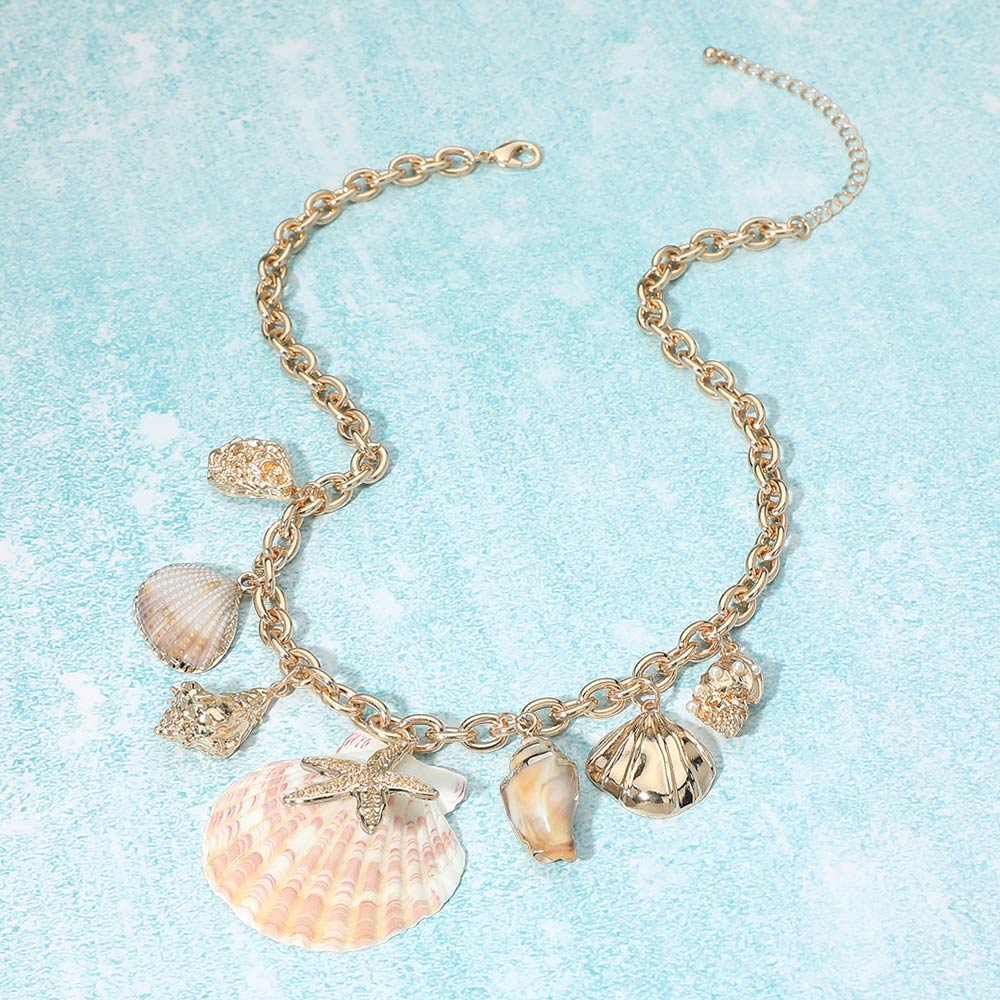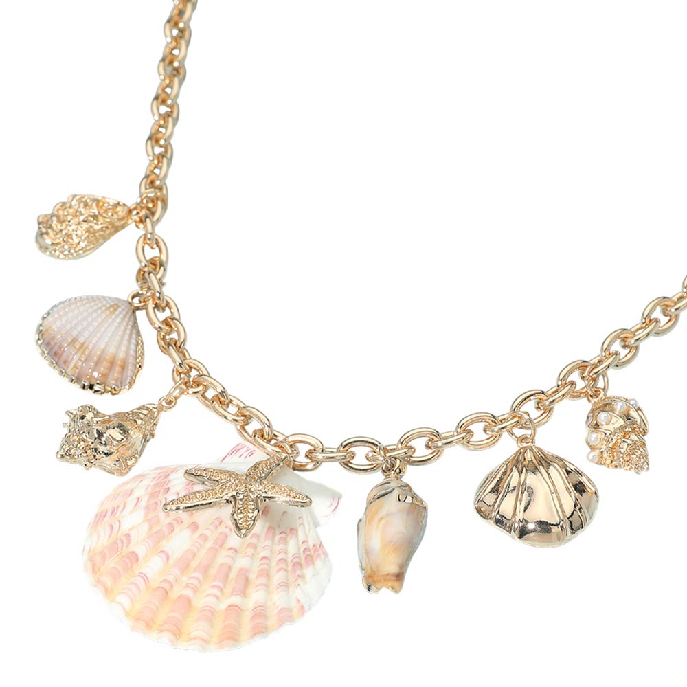 Details • Necklace Size : 18" + 3.25" L • Decor Size : 2" L • This seashell charm necklace showcases a layered arrangement of ocean-inspired charms suspended along a classic chain for eye-catching movement and texture. Designed to elevate resort, summer, and vacation collections, it offers strong visual impact, easy outfit pairing, and gift-ready appeal. Ideal for boutiques seeking beach-themed statement jewelry with playful yet polished styling. • Lead and Nickel Compliant