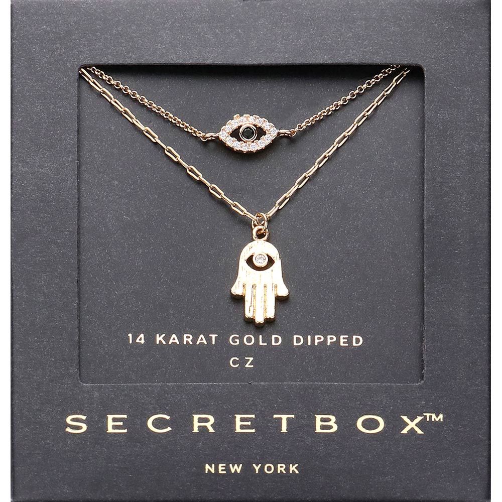 SECRET BOX_Sterling Silver Dipped CZ Stone Paved Hamsa Hand Evil Eye Pointed Pendant Layered Necklace
