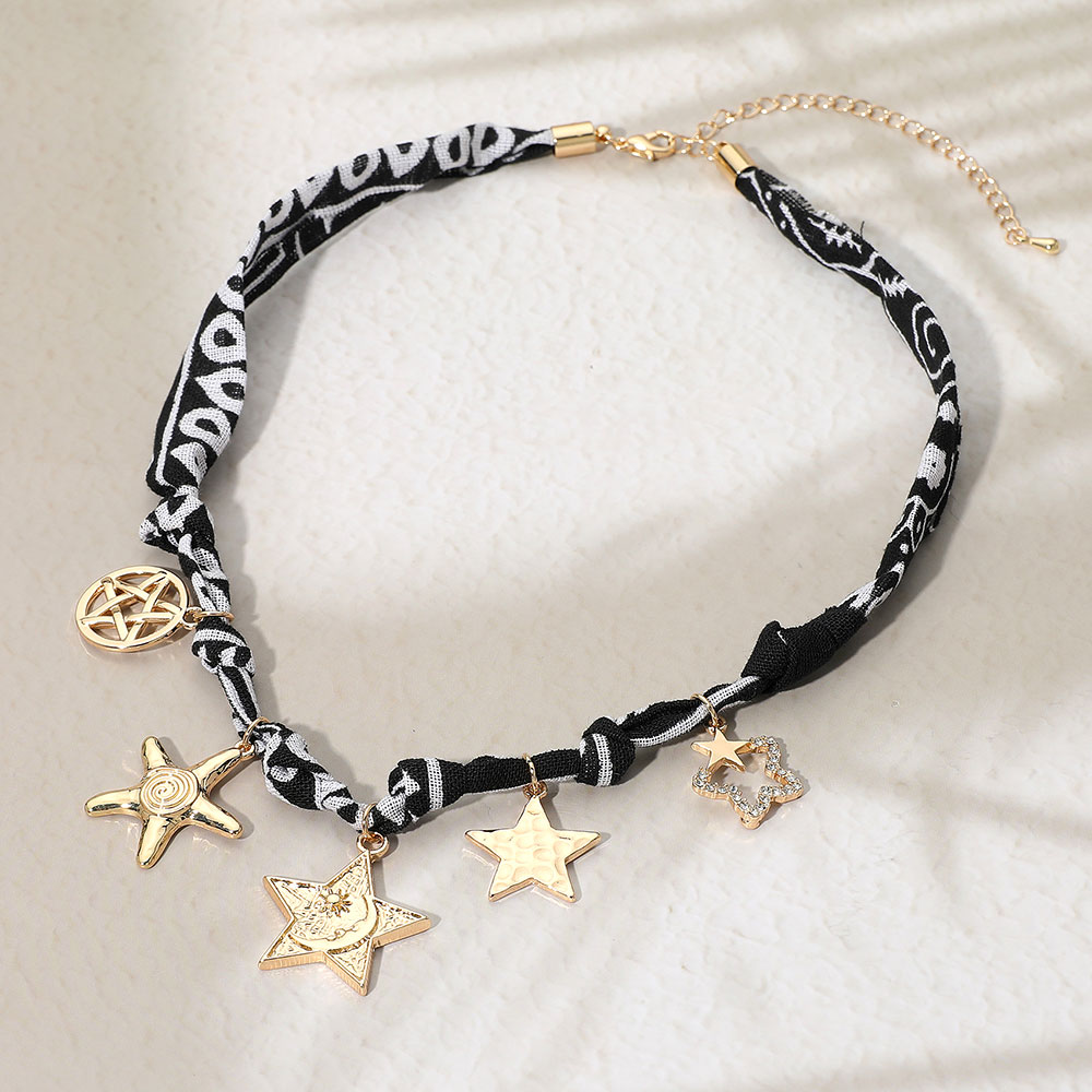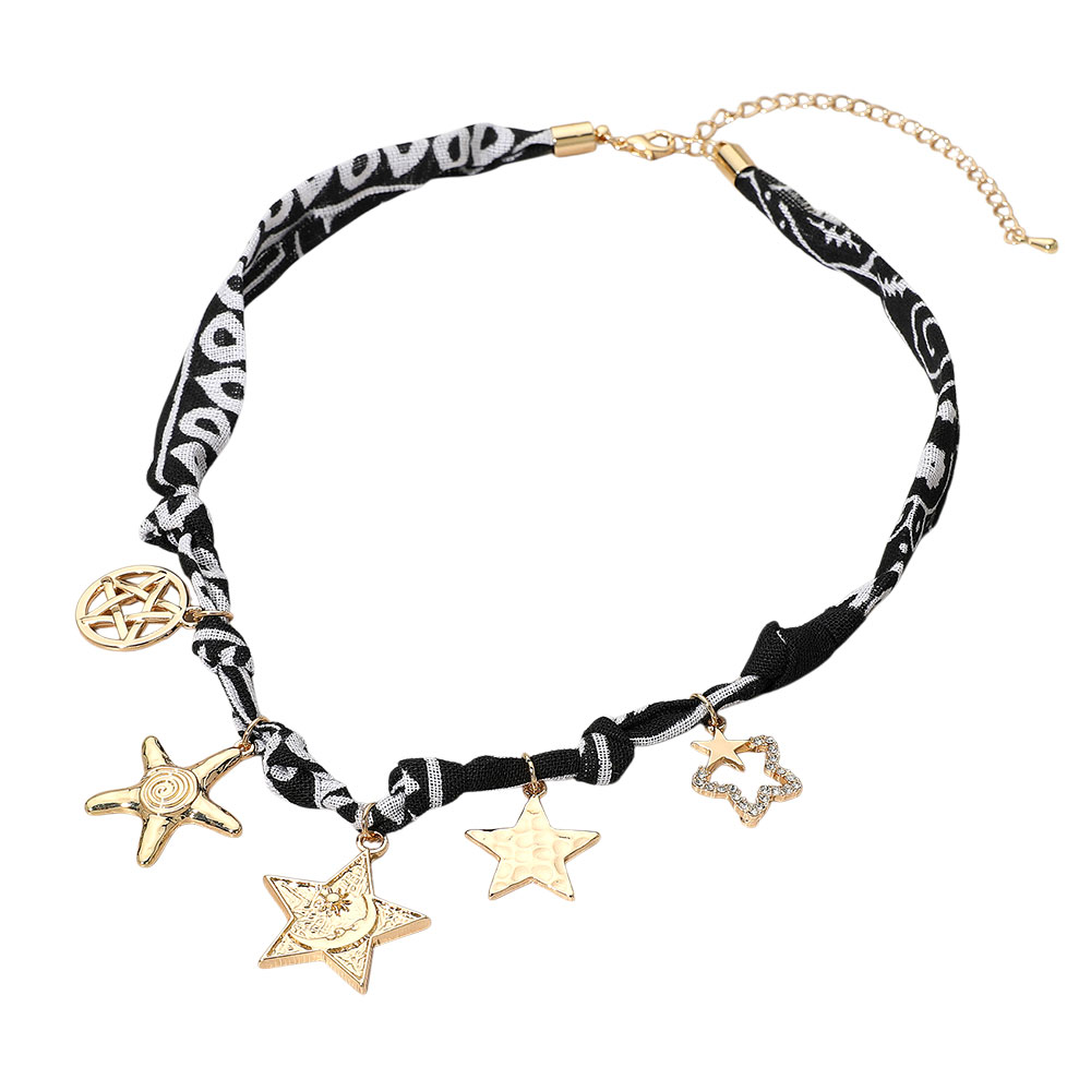 Details • Necklace Size : 16" + 3" L • Decor Size : 1.25" L • Stylish bandana necklace featuring an array of star-shaped charms and a pentagram pendant. Adjustable fit makes it perfect for layering or wearing alone, adding a bold and celestial-inspired touch to casual, festival, or statement looks. • Lead and Nickel Compliant