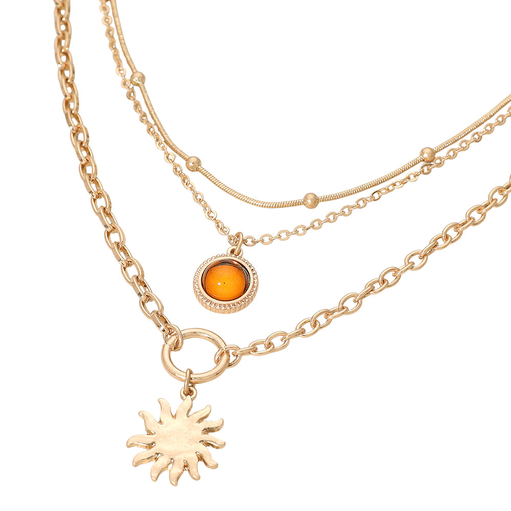 Details • Necklace Size : 14.5" + 3.5" L • Decor Size : 3.4" L • Brighten your look with the Layered Sun Charm Necklace, featuring multiple delicately layered chains accented by a radiant sun charm and a round focal detail that adds dimension and style. Perfect for everyday outfits or pairing with other necklaces to create a personalized, trend-forward layered statement. • Lead and Nickel Compliant