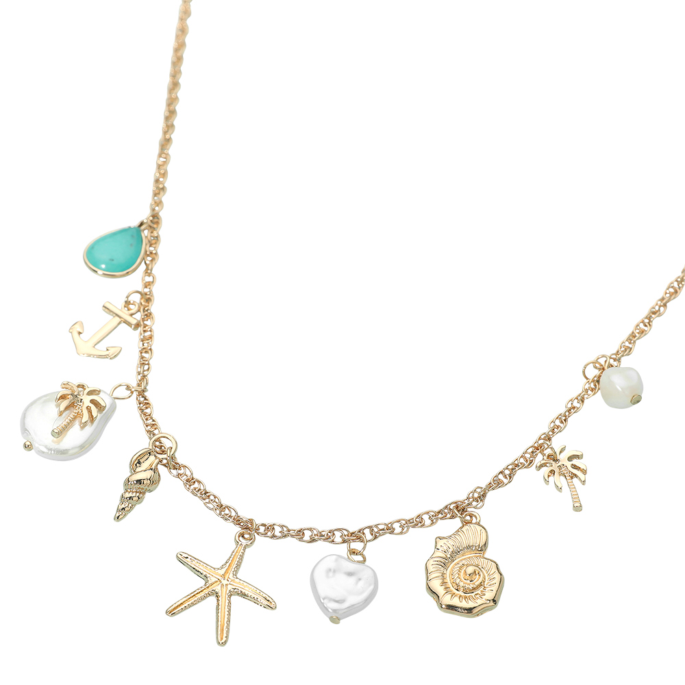 Details • Necklace Size : 16" + 3.25" L • Decor Size : 1" L • Charming pendant necklace featuring a collection of coastal-inspired motifs arranged along a delicate chain for playful, layered style. Designed to add personality and movement, this necklace enhances everyday outfits, vacation looks, and casual styling while offering standout appeal for boutique accessory collections. • Lead and Nickel Compliant