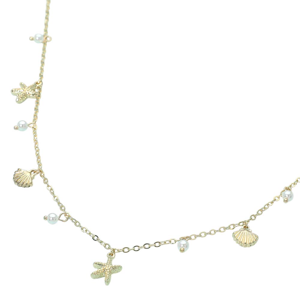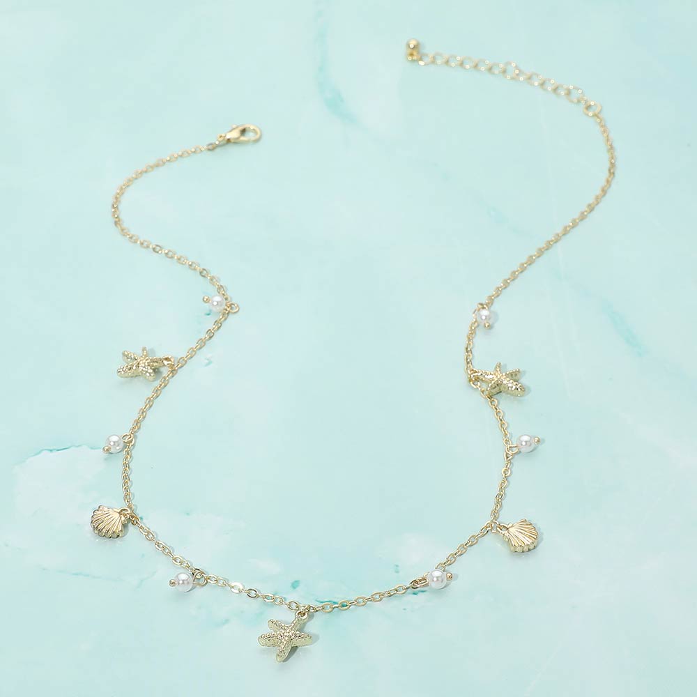 Details • Necklace Size : 16.5" + 2.25" L • Decor Size : 0.7"l • This sea life charm necklace features a delicate chain accented with ocean-inspired charms and subtle bead details that add graceful movement and visual interest. Designed for easy layering or standalone wear, it offers a relaxed yet polished accent ideal for everyday styling, vacation looks, gifting collections, and coastal-themed jewelry assortments. • Lead and Nickel Compliant