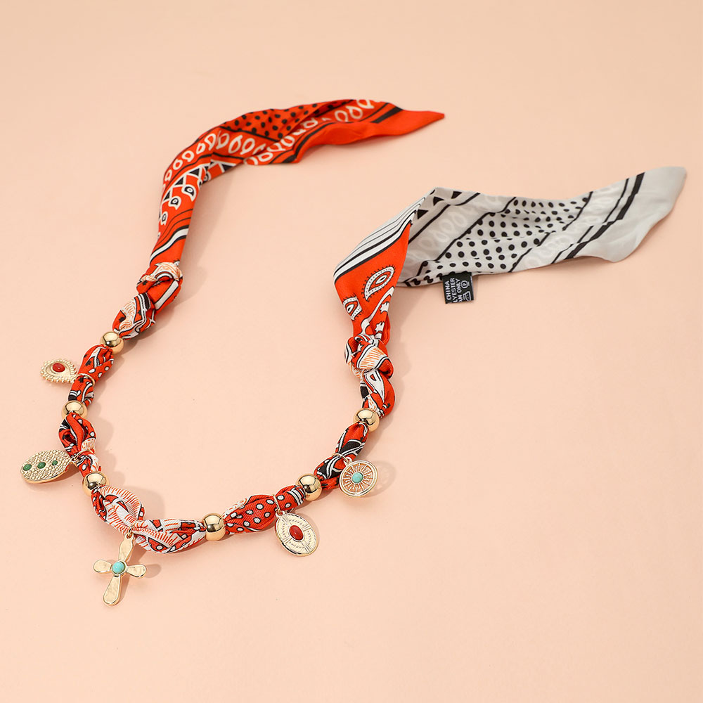 Stone Accent Boho Charm Station Fabric Scarf Adjustable Necklace