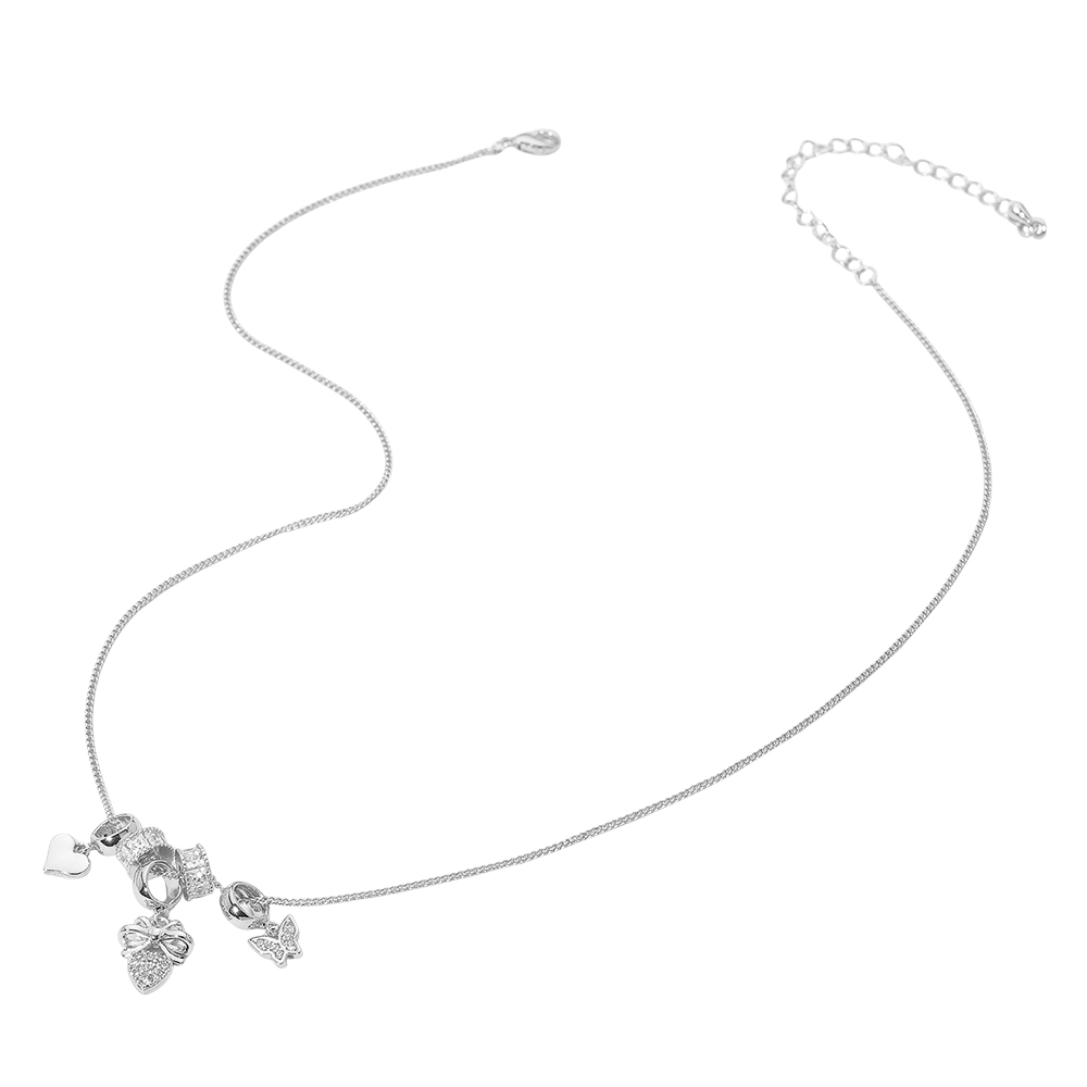Details • Necklace Size : 16" + 3.25" L • Decor Size : 0.75" L • Charming necklace featuring dainty heart and leaf-shaped pendants adorned with shimmering crystal accents. Set on a sleek, fine chain, this delicate piece adds a romantic and playful touch to any outfit. Ideal for gifting or adding sparkle to your everyday jewelry collection. • Lead and Nickel Compliant • Brass