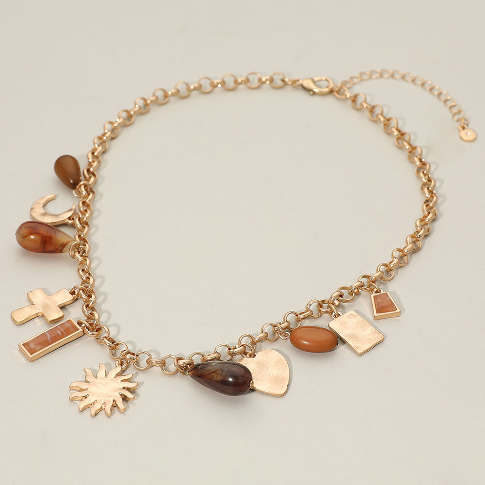 Sunburst Cross Heart Teardrop Stone Charm Station Necklace