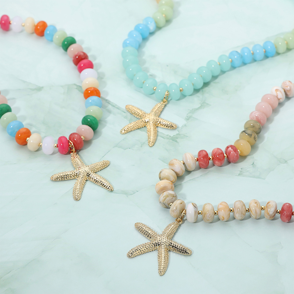 Details • Necklace Size : 18" + 4" L • Decor Size : 2" L • Playful beaded necklace featuring colorful round beads accented with a textured starfish pendant. A vibrant and stylish accessory perfect for beach outings, summer looks, or adding a fun coastal vibe to everyday wear. • Lead and Nickel Compliant