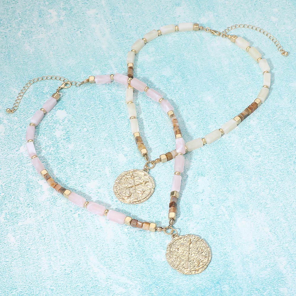 • This beaded necklace features a refined sequence of geometric beads accented by a textured coin pendant that adds symbolic charm and visual focus. Designed for easy everyday styling, it layers beautifully or stands alone as a subtle statement. A versatile choice for boutiques seeking modern, giftable jewelry with timeless appeal and effortless wearability.
