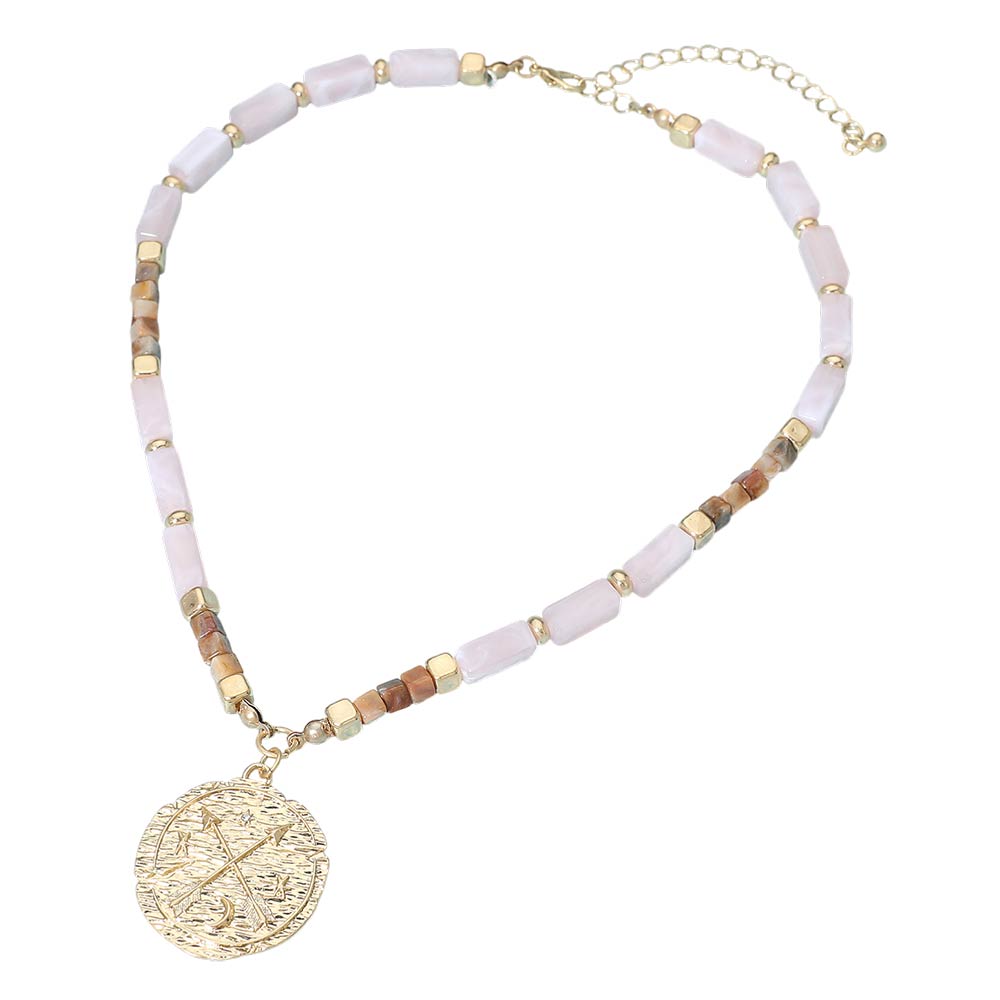 Details • Necklace Size : 16.5" + 3.5" L • Pendant Size : 1.25" X 1.3" • This beaded necklace features a refined sequence of geometric beads accented by a textured coin pendant that adds symbolic charm and visual focus. Designed for easy everyday styling, it layers beautifully or stands alone as a subtle statement. A versatile choice for boutiques seeking modern, giftable jewelry with timeless appeal and effortless wearability. • Lead and Nickel Compliant