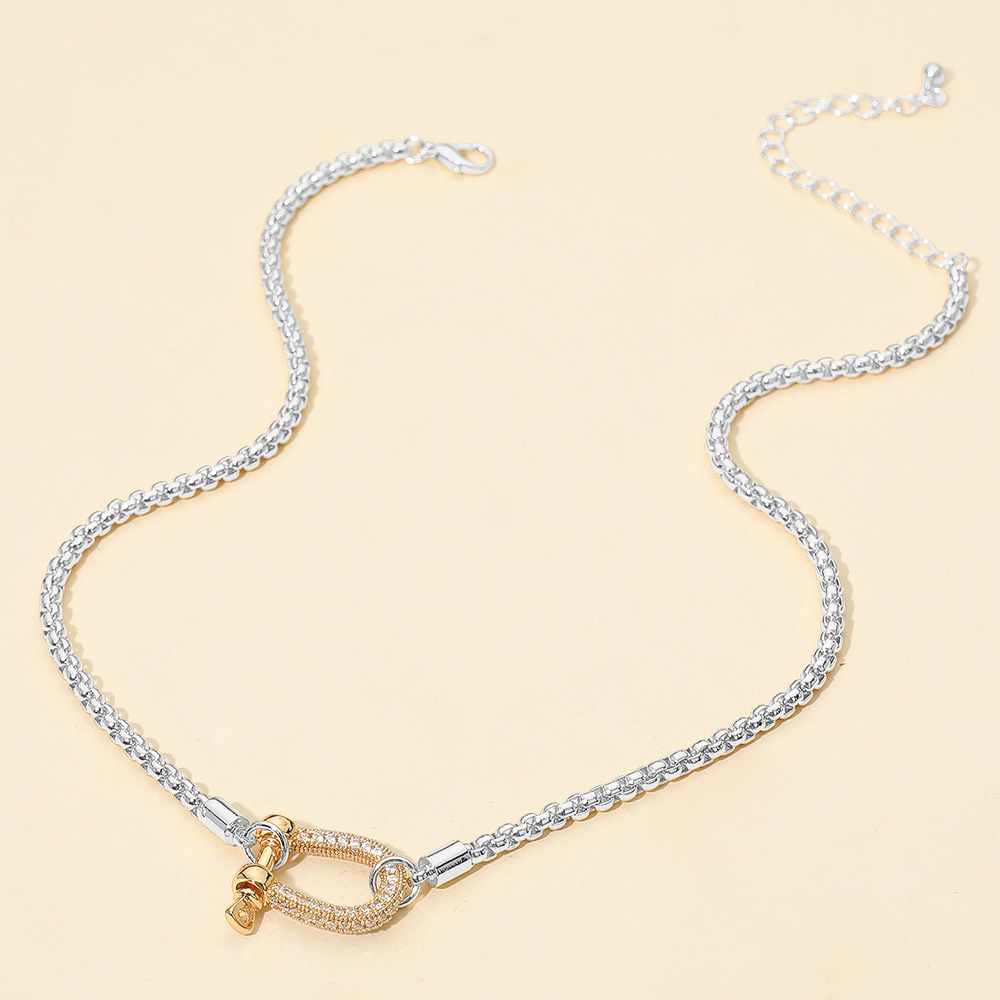 Two Tone Stone Paved Horsebit Carabiner Pendant Link Box Chain Necklace