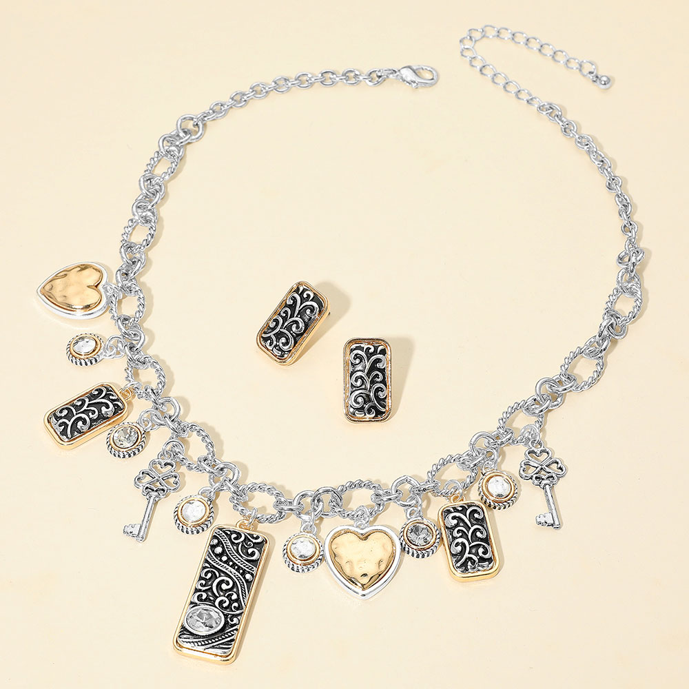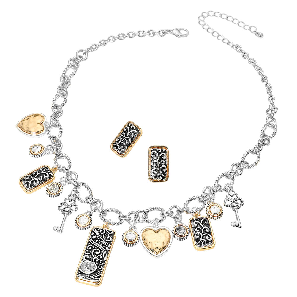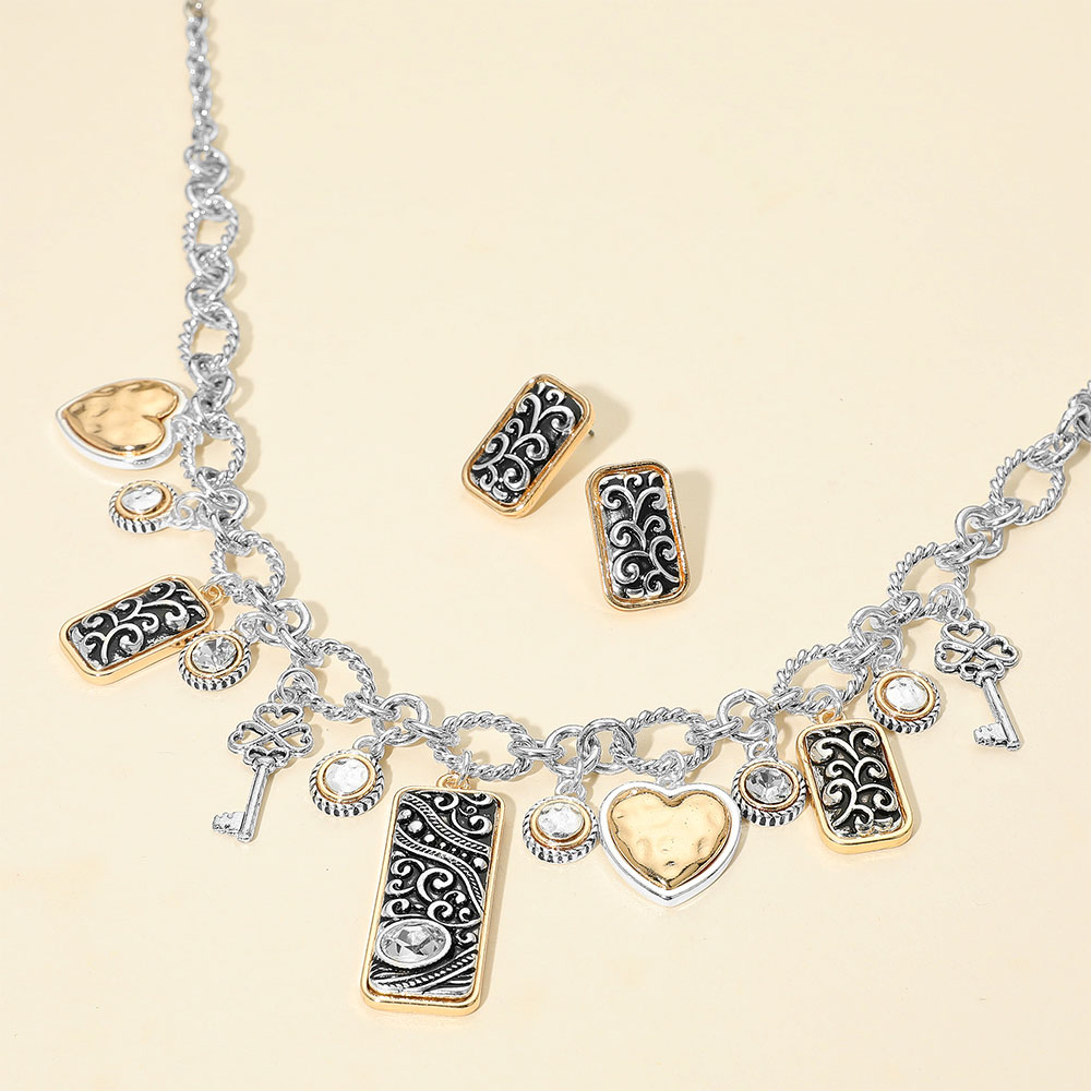 Details • Necklace Size : 16" + 3" L • Decor Size : 2" L • Earrings Size : 0.8" L • Intricately designed necklace and earring set featuring ornate charms, including hearts, keys, and decorative panels. A timeless accessory that adds elegance and sophistication to both casual and formal outfits. • Lead and Nickel Compliant
