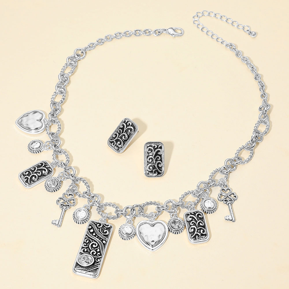 Details • Necklace Size : 16" + 3" L • Decor Size : 2" L • Earrings Size : 0.8" L • Intricately designed necklace and earring set featuring ornate charms, including hearts, keys, and decorative panels. A timeless accessory that adds elegance and sophistication to both casual and formal outfits. • Lead and Nickel Compliant