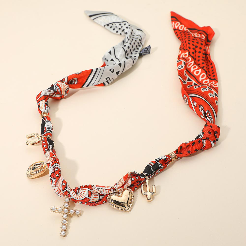 • Chic patterned scarf necklace adorned with gold-tone charms including a heart, cross, and cactus. The soft fabric ties elegantly at the neck for adjustable wear, blending boho flair with charm jewelry style—perfect for layering or making a bold statement accessory.