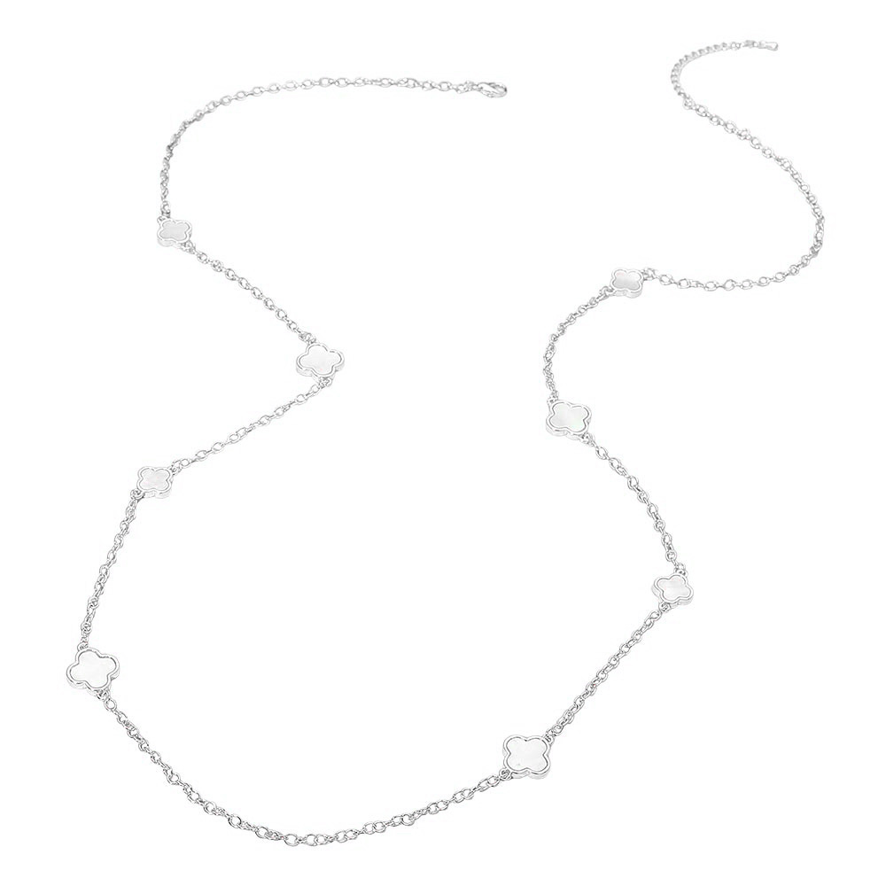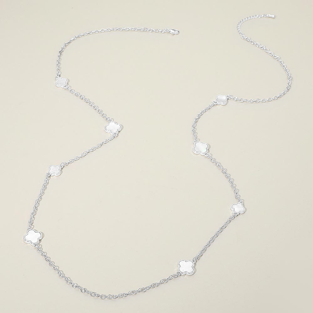 • This long station necklace features delicate quatrefoil-shaped accents arranged along a refined chain, creating an elegant, versatile accessory. Its lightweight design makes it perfect for layering or wearing alone, offering a polished touch that transitions effortlessly from day to evening.