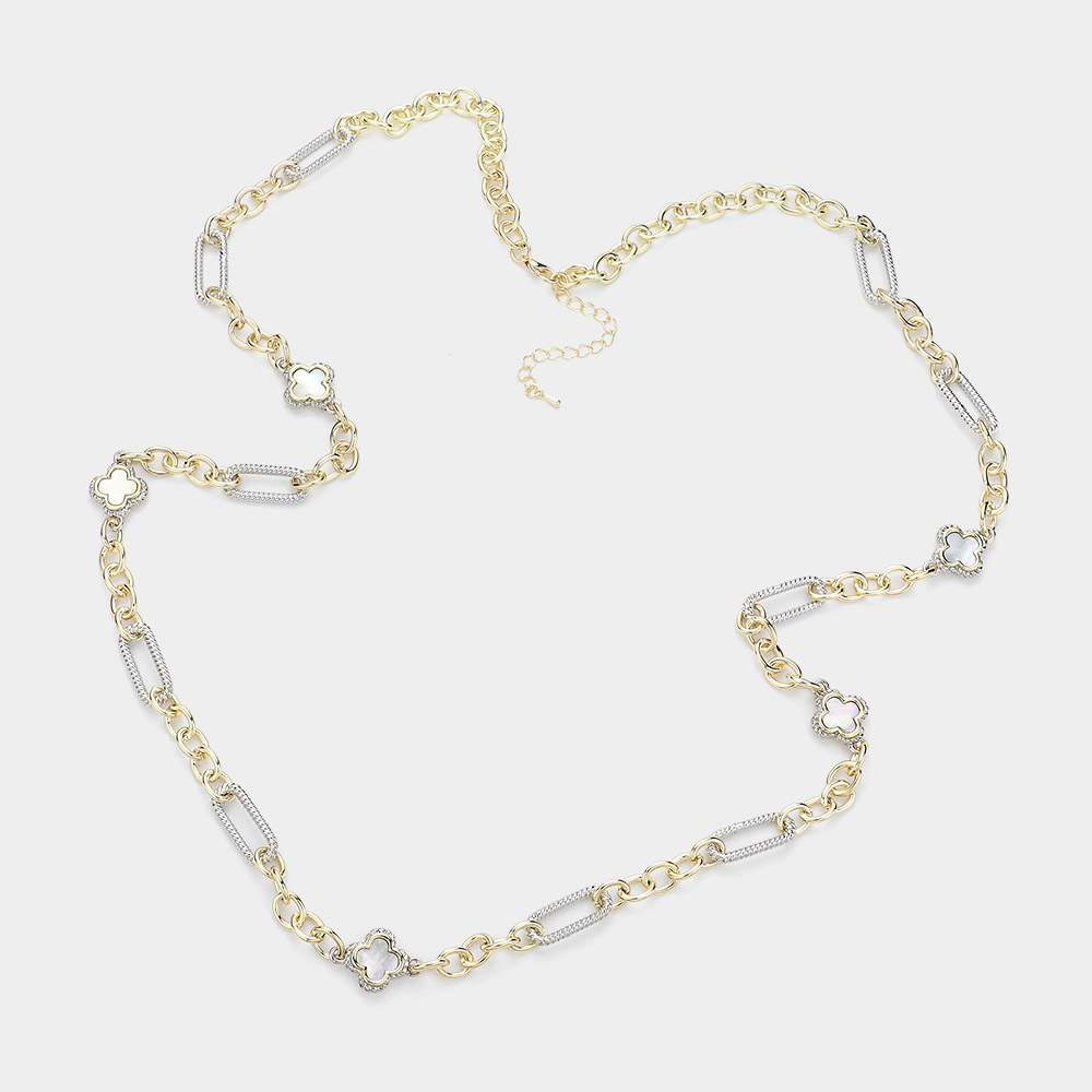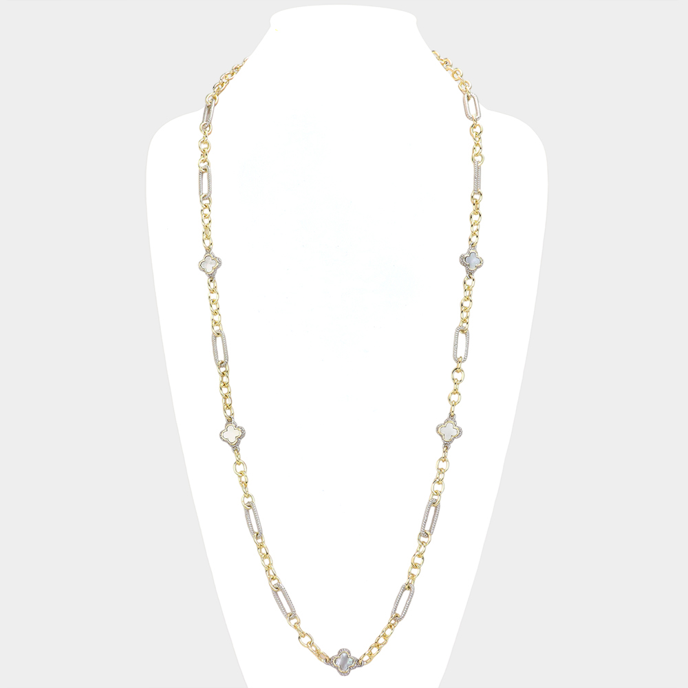 14K Gold Plated Two Tone Stone Paved Quatrefoil Station Chain Link Long Necklace