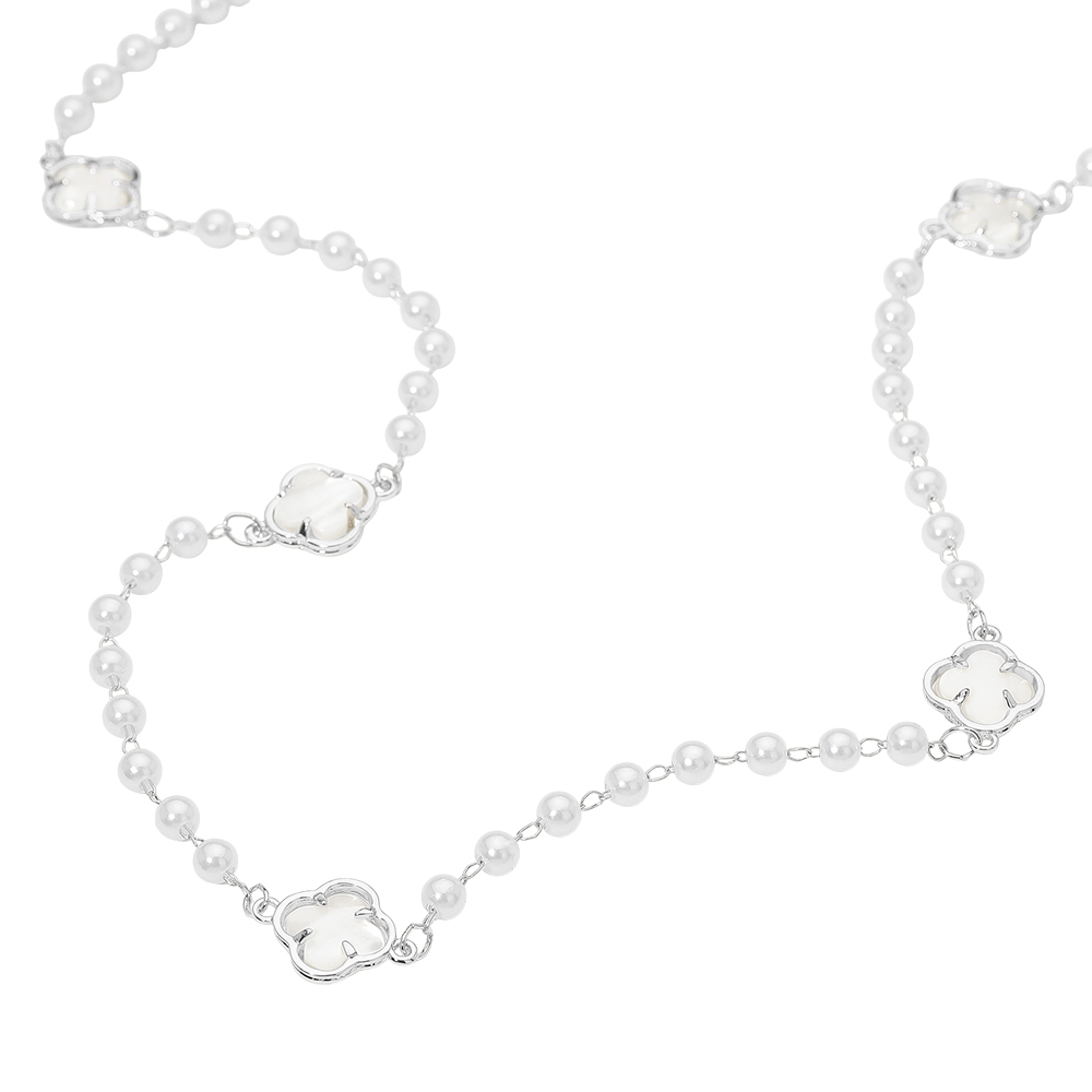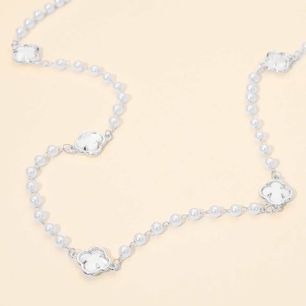 Details • Necklace Size : 36" + 3.5" L • Decor Size : 0.6" L • A delicate strand featuring evenly spaced round pearl accents and quatrefoil-inspired connectors that create a graceful, balanced look. Perfect for everyday elegance or special occasions with a refined, timeless aesthetic. • Lead and Nickel Compliant