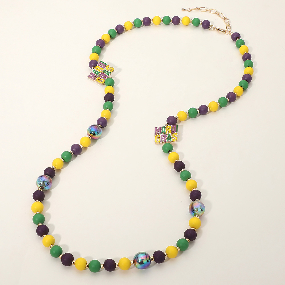 Details • Necklace Size : 34" + 3.25" L • Decor Size : 0.9" L • Statement Mardi Gras–inspired necklace designed with smooth round beads, luminous accent beads, and decorative charm details spaced throughout the strand. Finished with an adjustable chain for comfortable wear. Ideal for parade outfits, themed events, party styling, and festive boutique displays. A versatile accessory that adds playful character and celebration-ready appeal. • Lead and Nickel Compliant