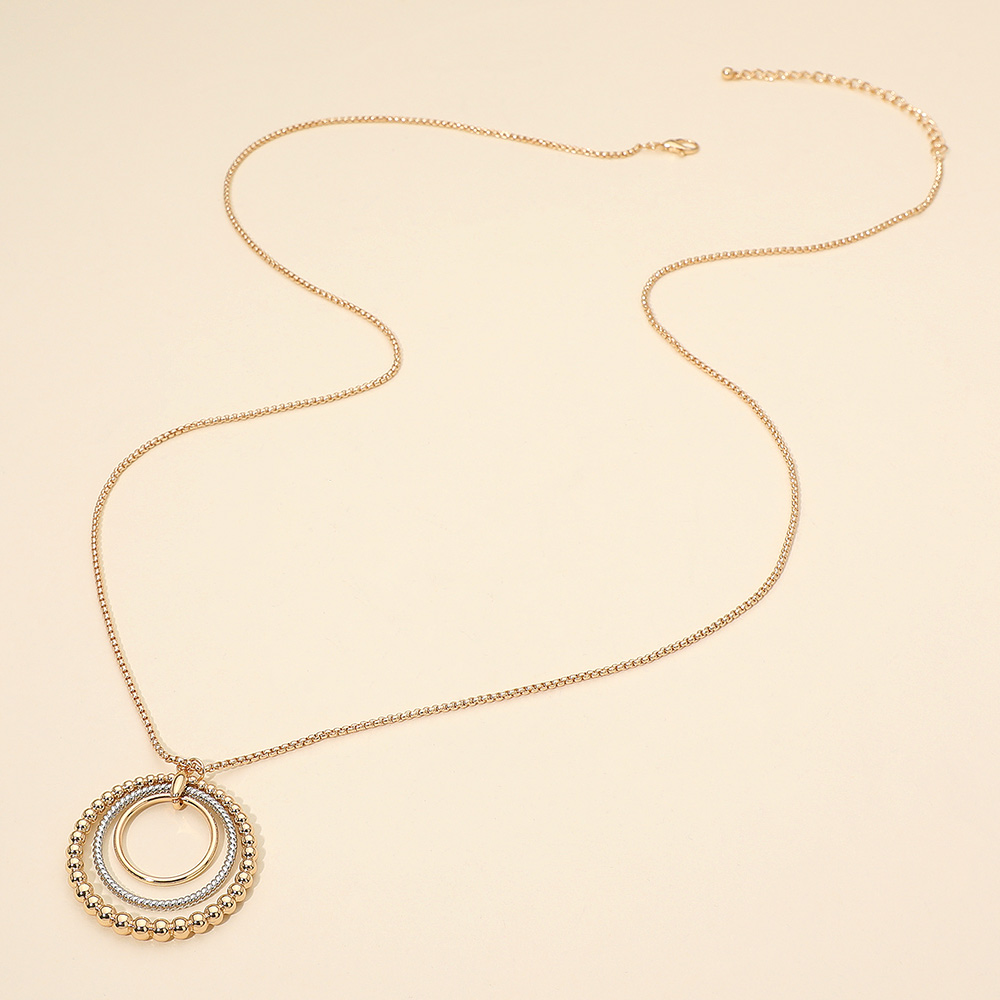 Details • Necklace Size : 34.5" + 3.5" L • Pendant Size : 1.7" X 1.75" • Features layered circular pendants with contrasting textures on a sleek chain for a modern, eye-catching look. Designed to add subtle movement and standout style to everyday outfits or dressier ensembles. • Lead and Nickel Compliant