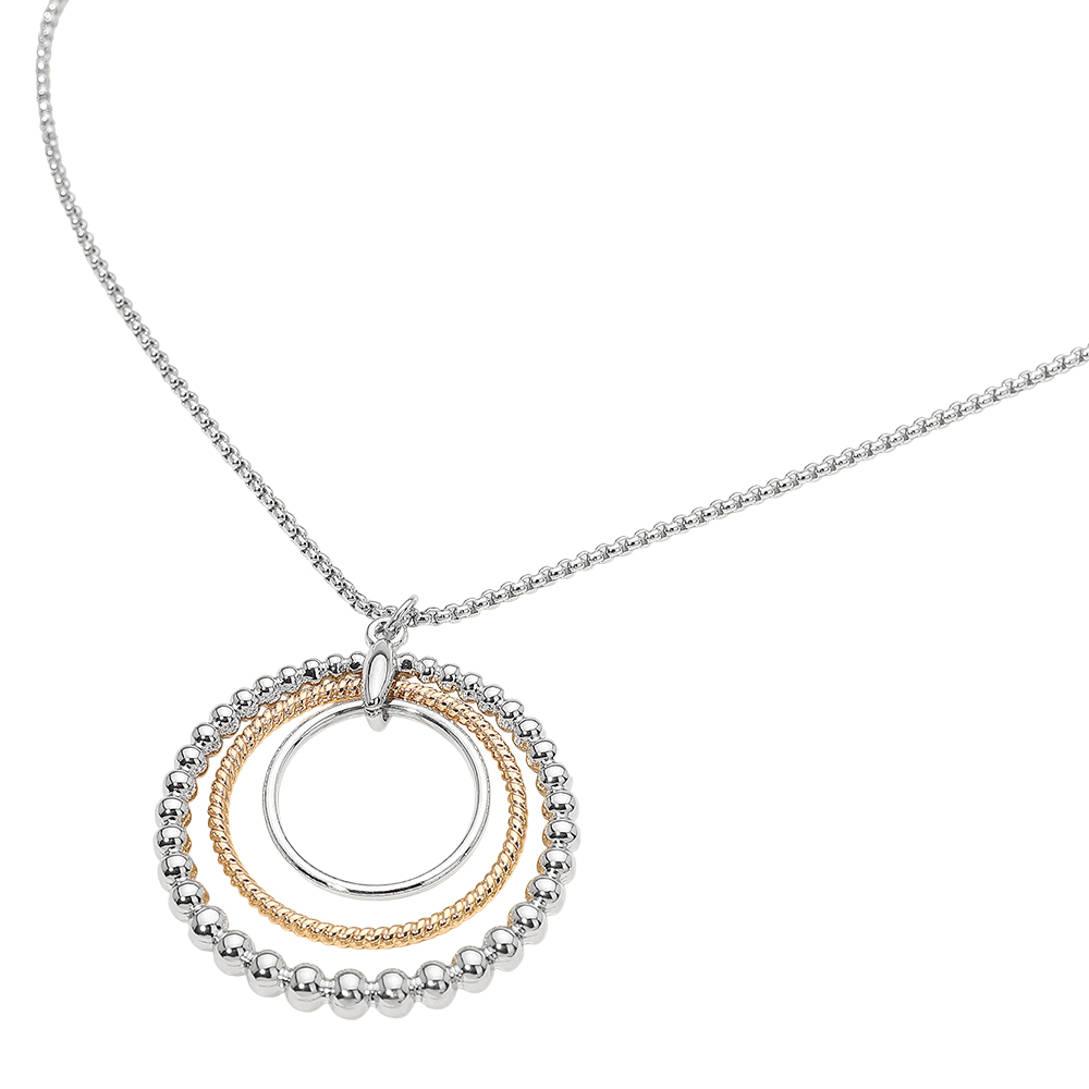 Details • Necklace Size : 34.5" + 3.5" L • Pendant Size : 1.7" X 1.75" • Features layered circular pendants with contrasting textures on a sleek chain for a modern, eye-catching look. Designed to add subtle movement and standout style to everyday outfits or dressier ensembles. • Lead and Nickel Compliant