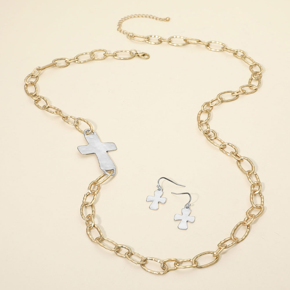 • Coordinated necklace and earring set featuring bold cross accents and an elongated chain silhouette for meaningful, statement-ready style. Designed to elevate everyday outfits and special occasions, this set offers a balanced blend of symbolism and modern appeal for boutique collections and gifting.