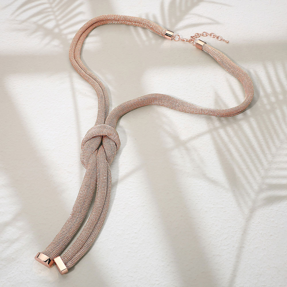 Details • Necklace Size : 33" + 3.25" L • Decor Size : 8" L • Sleek statement necklace featuring a soft, flexible silhouette with a sculptural knot detail for modern elegance. Designed to drape smoothly and add visual interest, this necklace enhances everyday outfits, workwear, and special occasions with refined, fashion-forward appeal. • Lead and Nickel Compliant