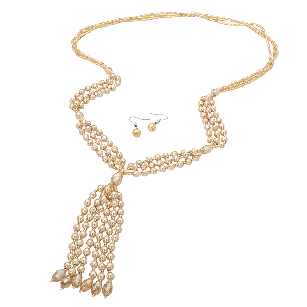 • This beaded necklace set features a layered strand design with an elegant tassel drop centerpiece and matching dangle earrings. Created to make a statement, it’s ideal for evening wear, special events, or elevated everyday styling. A bold yet versatile accessory set perfect for boutiques seeking dramatic silhouette, movement, and refined detail in curated jewelry collections.