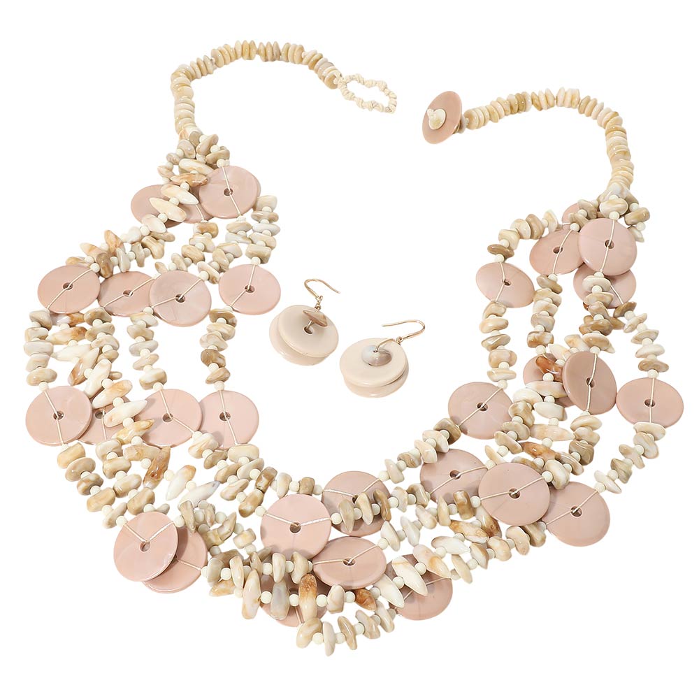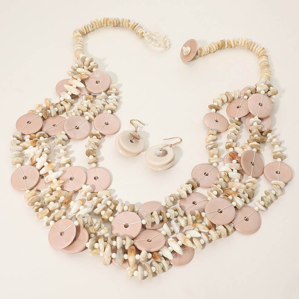 Details • Necklace Size : 32" + 1" L • Decor Size : 2.75" L • Earrings Size : 1.8" L • This layered disc statement necklace set features cascading round accents paired with textured detailing and matching earrings for a bold yet organic look. Designed to elevate boutique collections, it offers strong visual movement and dimension, making it ideal for statement styling, resort-inspired outfits, special occasions, and fashion-forward everyday wear. • Lead and Nickel Compliant