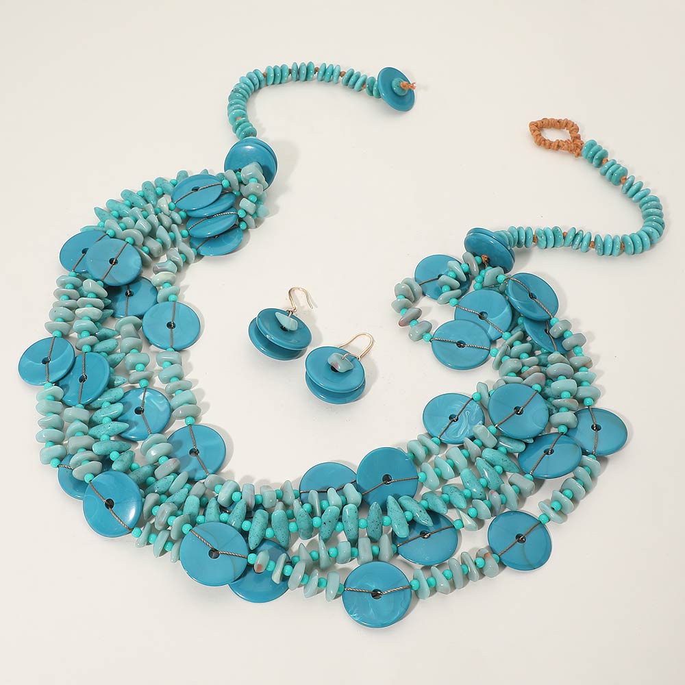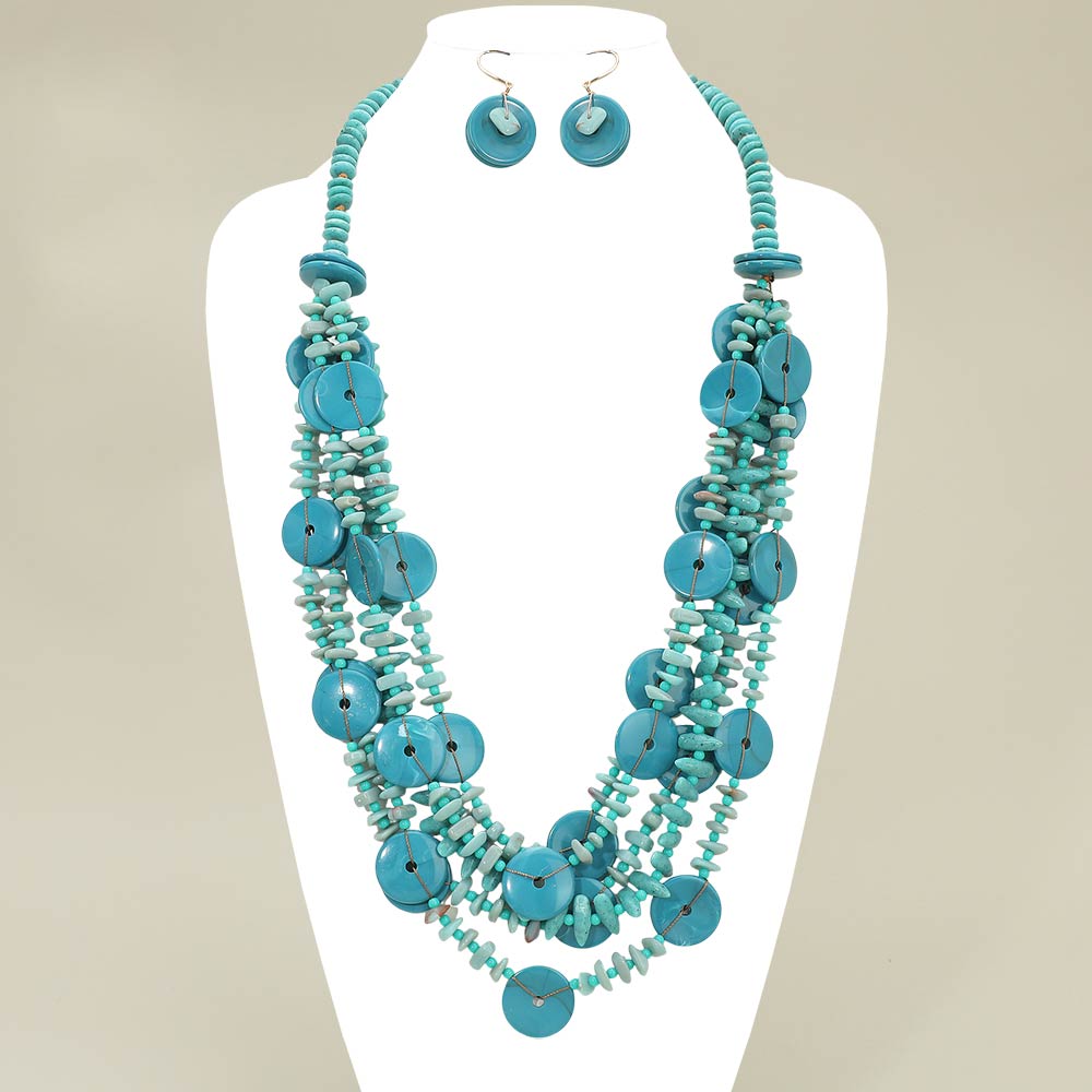 Details • Necklace Size : 32" + 1" L • Decor Size : 2.75" L • Earrings Size : 1.8" L • This layered disc statement necklace set features cascading round accents paired with textured detailing and matching earrings for a bold yet organic look. Designed to elevate boutique collections, it offers strong visual movement and dimension, making it ideal for statement styling, resort-inspired outfits, special occasions, and fashion-forward everyday wear. • Lead and Nickel Compliant