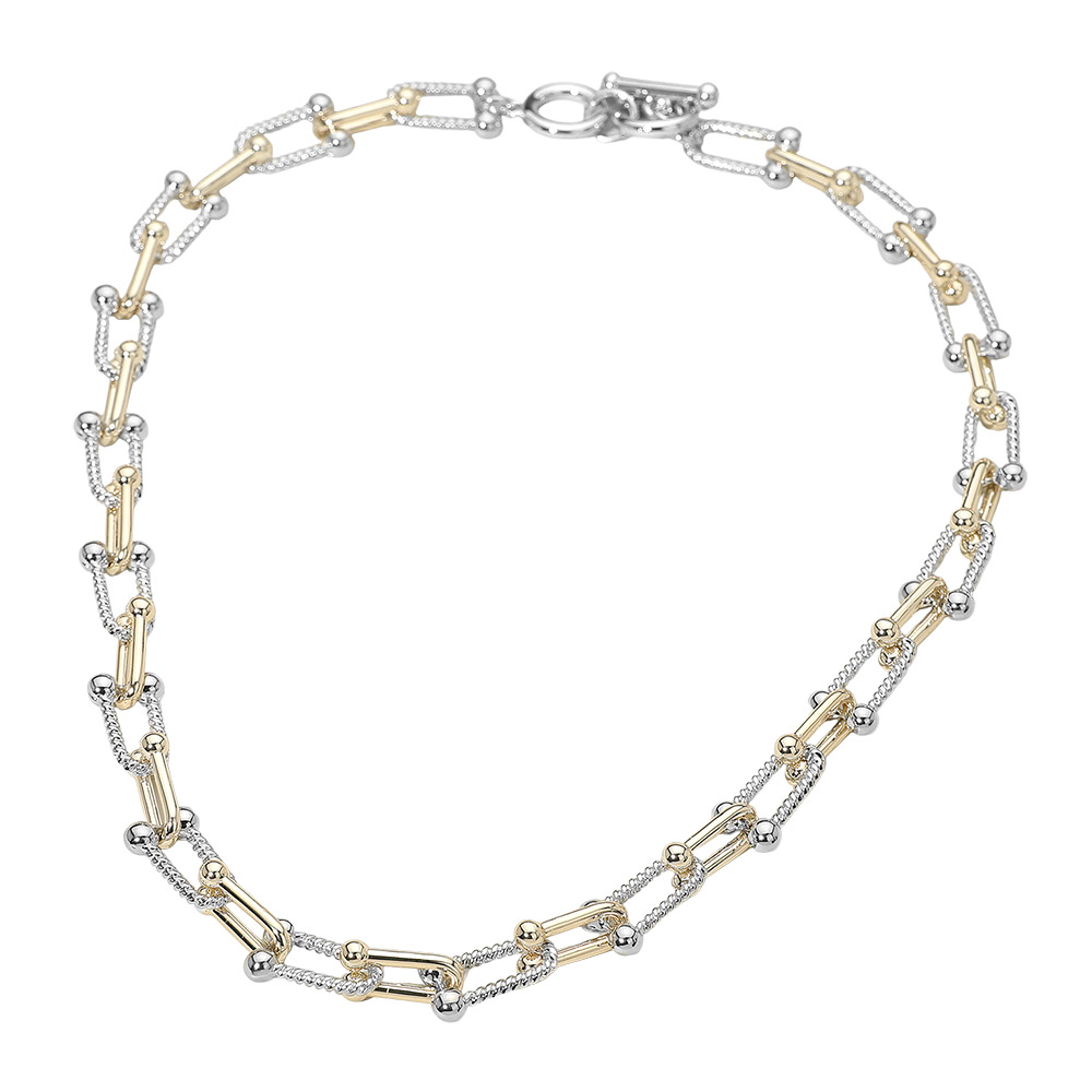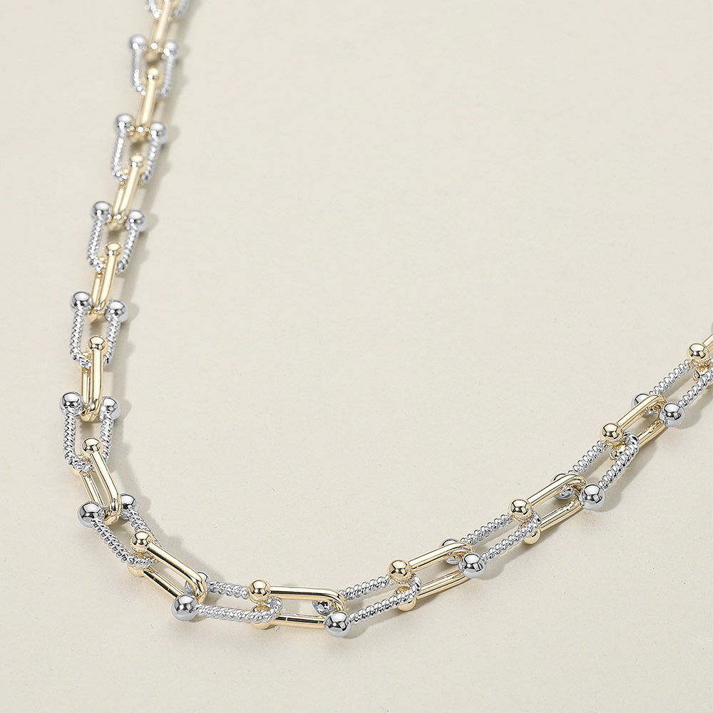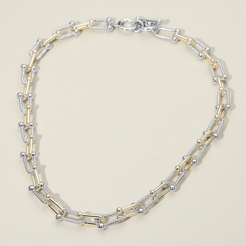• A refined linked chain necklace designed with intricate dual-tone detailing for a standout look. Its layered connectors and polished accents create a modern, elevated style that pairs effortlessly with everyday outfits or special occasions. A versatile accessory with timeless appeal.