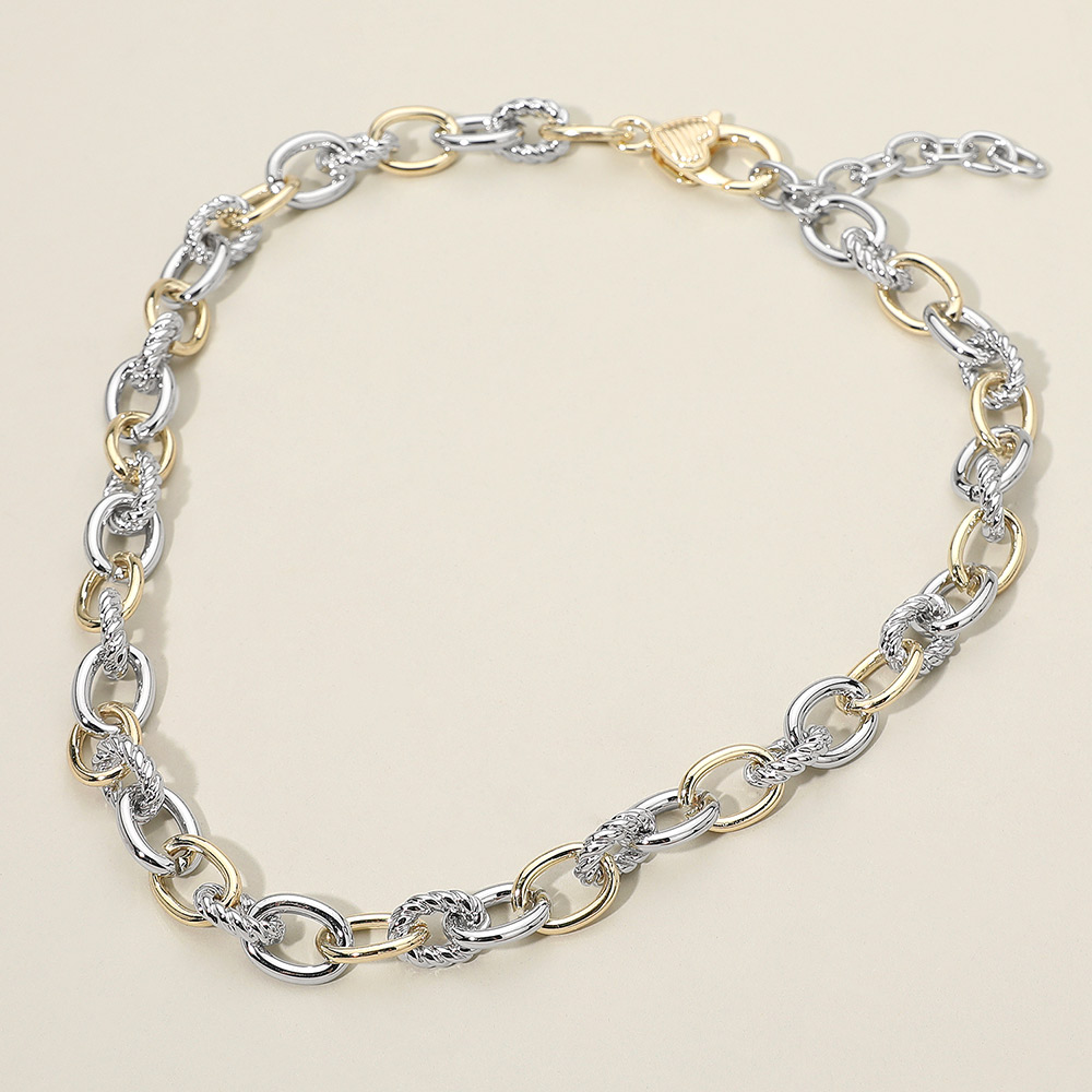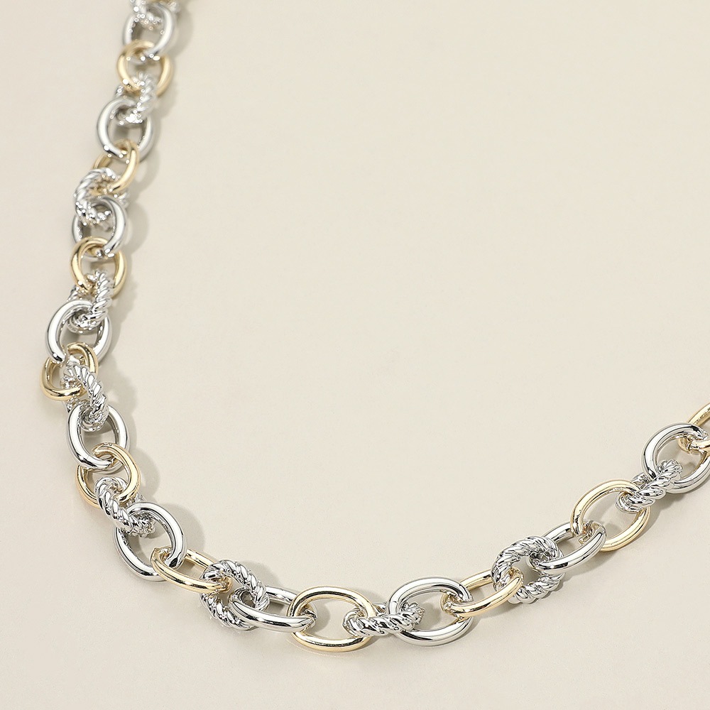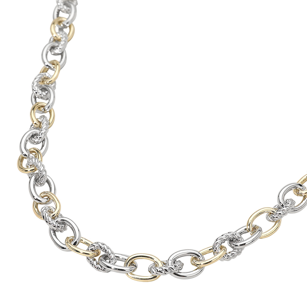 Details • Necklace Size : 16.5" + 2.25" L • Decor Size : 0.4" L • Interlocking Rope Link Chain Necklace features alternating smooth and twisted links that create bold texture and elegant movement. Designed to layer effortlessly or stand alone as a statement piece, it offers everyday versatility, comfortable wear, and timeless appeal for any occasion. • Gold Dipped