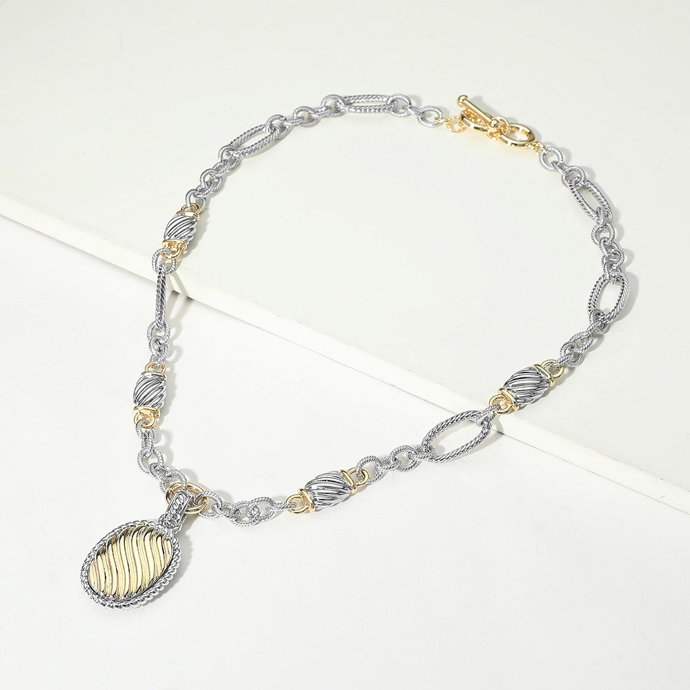 Details • Necklace Size : 18" + 1" L • Pendant Size : 0.8" X 1.8" • Toggle Closure • This oval pendant toggle chain necklace features mixed link detailing and a sculpted oval charm that adds dimension and interest to any look. Designed for effortless styling, it works beautifully as a standalone statement or layered with other necklaces, making it ideal for everyday wear, gifting, and boutique jewelry collections. • Gold Dipped