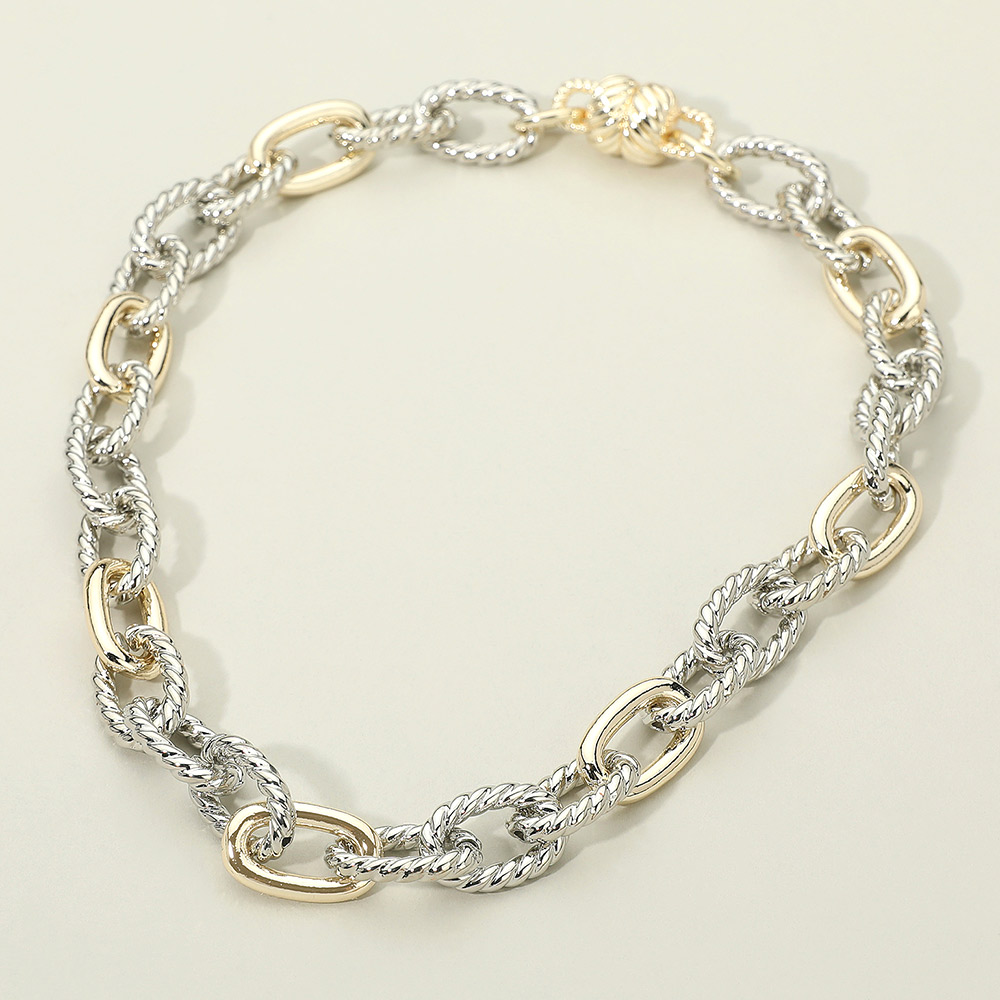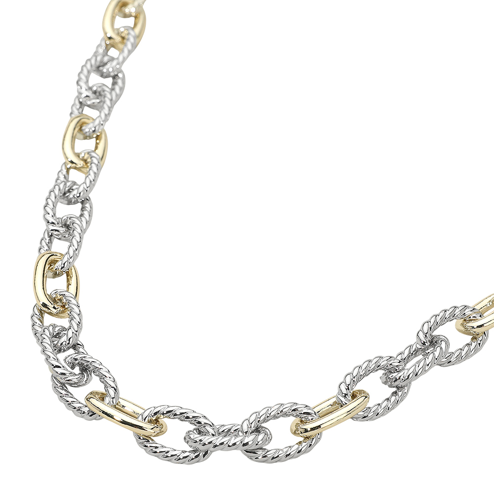 • A striking necklace featuring rope-textured oval links paired with smooth polished connectors for a bold two-tone effect. This chain design blends classic rope details with modern accents, perfect for layering or wearing solo as a statement piece.