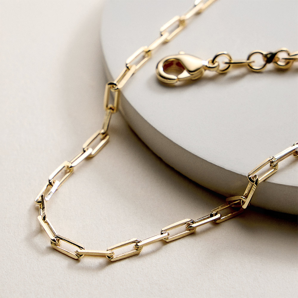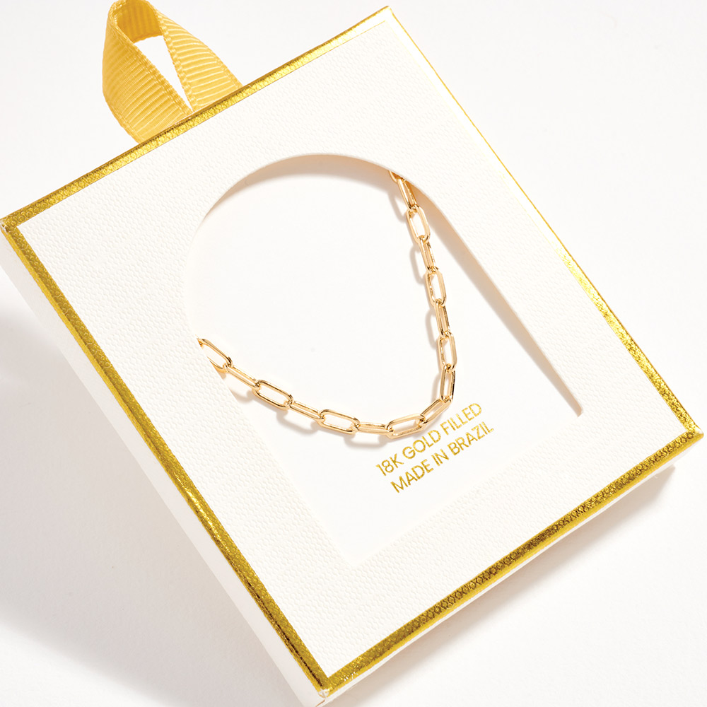 Details • Necklace Size : 15.5" + 1.75" L • Decor Size : 0.2" L • Minimalist elongated link chain bracelet designed with a clean, modern silhouette for effortless everyday styling. Ideal for wearing alone or layering with other bracelets. A versatile accessory that adds refined polish to casual looks, work outfits, and thoughtful gifting moments. • Gold Filled • Hypoallergenic • Lead and Nickel Compliant • Made In Brazil