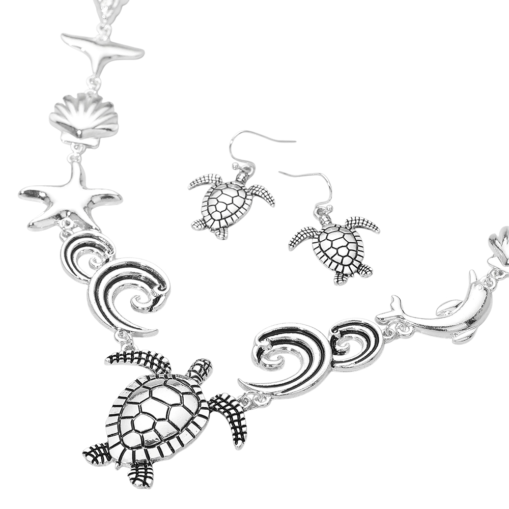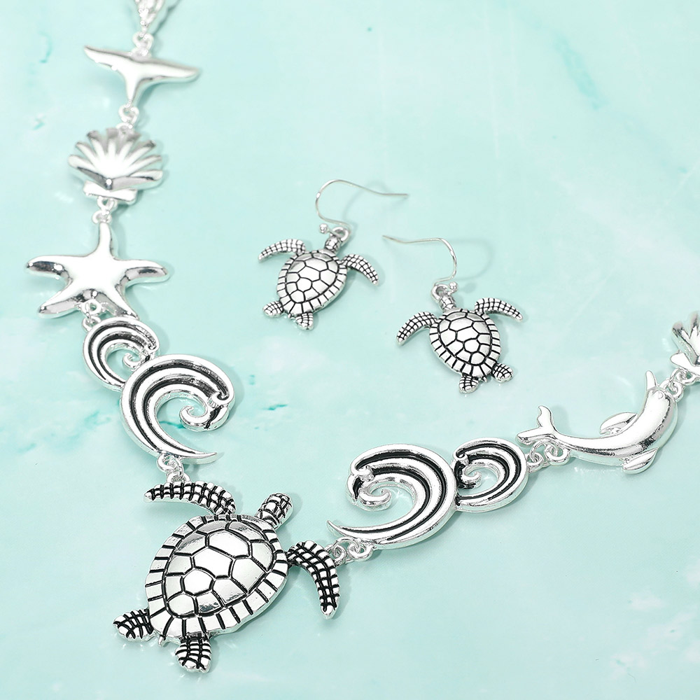 Details • Necklace Size : 18" + 3.25" L • Decor Size : 1.5" L • Earrings Size : 1.25" L • Sea turtle wave jewelry set featuring coordinated ocean-inspired designs that capture movement, balance, and coastal charm. A versatile statement collection ideal for everyday styling, gifting, or resort-inspired looks. Perfect for boutique assortments focused on marine, beach, and nature-themed fashion jewelry. • Lead and Nickel Compliant