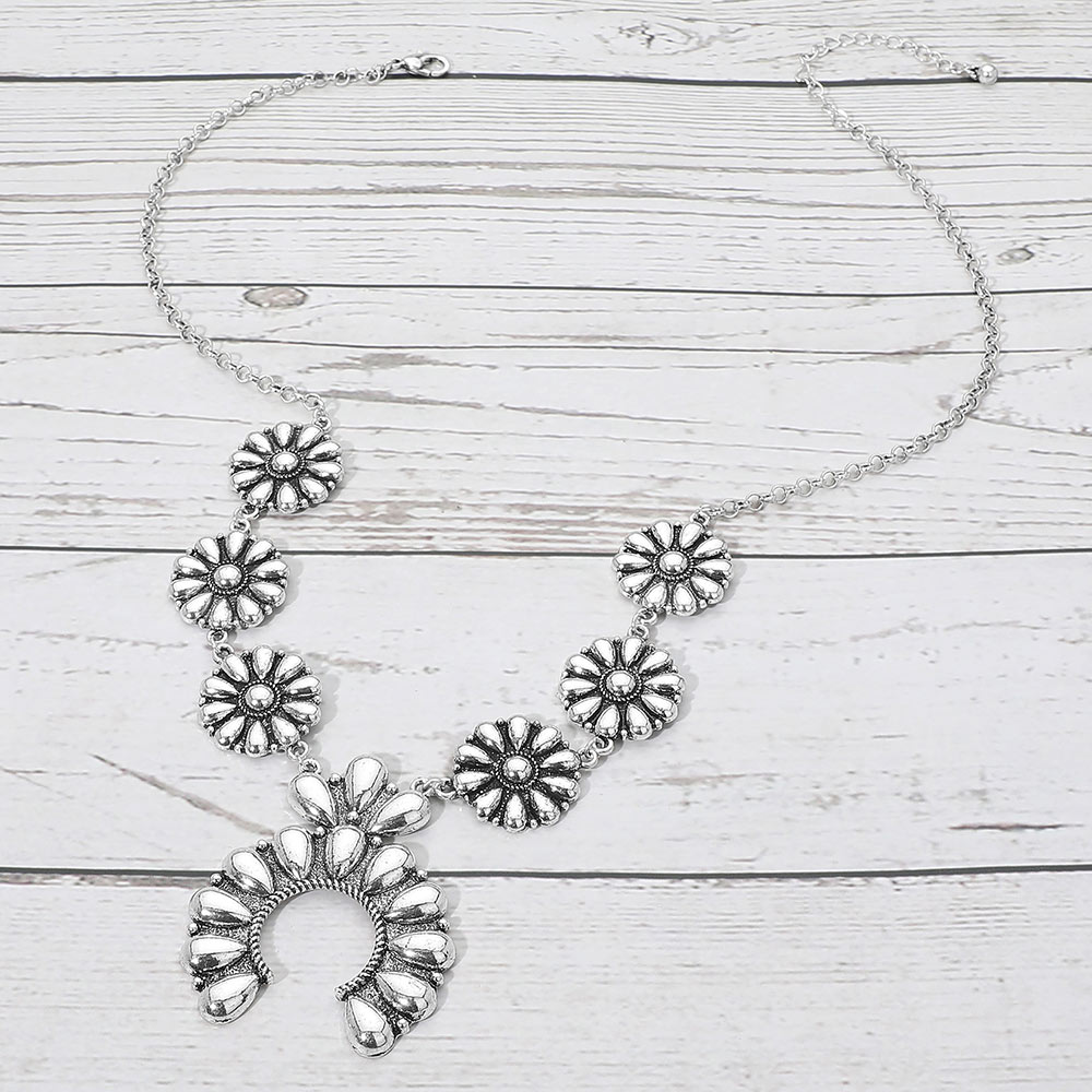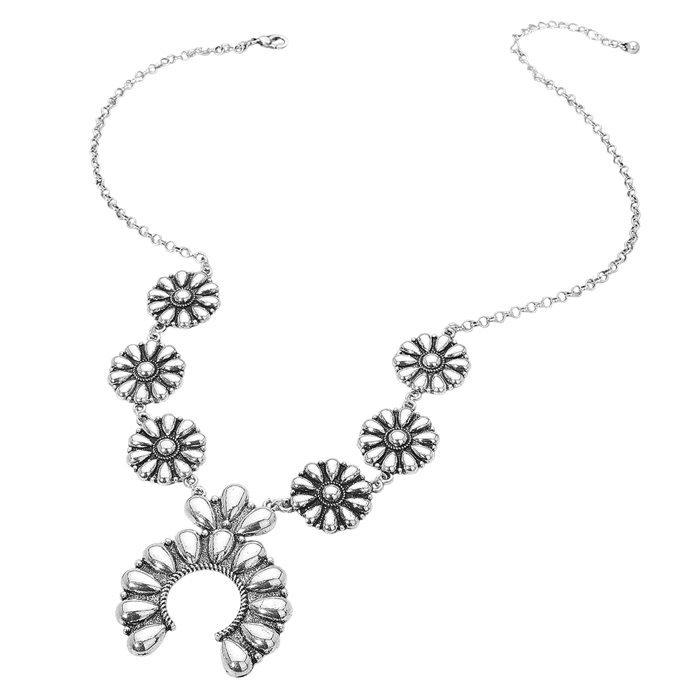 • Statement necklace featuring a cascading floral design that leads to a bold crescent charm centerpiece. Crafted to create visual impact with intricate detailing and balanced movement, this necklace is ideal for boho, western-inspired, festival, or boutique jewelry collections seeking an eye-catching focal piece.