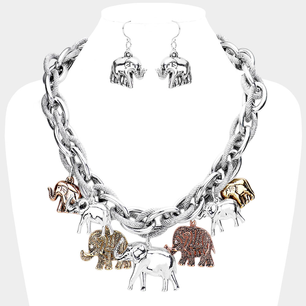 Details • Necklace Size : 18" + 3" • Decor Size : 2" • Earring Size : 1.5" L • Bold statement necklace featuring layered chain styling accented with detailed elephant charms and a coordinated drop earring pair. Designed to create visual impact, this playful yet elegant set adds character and charm to everyday outfits, themed looks, and special occasions with an eye-catching silhouette. • Lead and Nickel Compliant