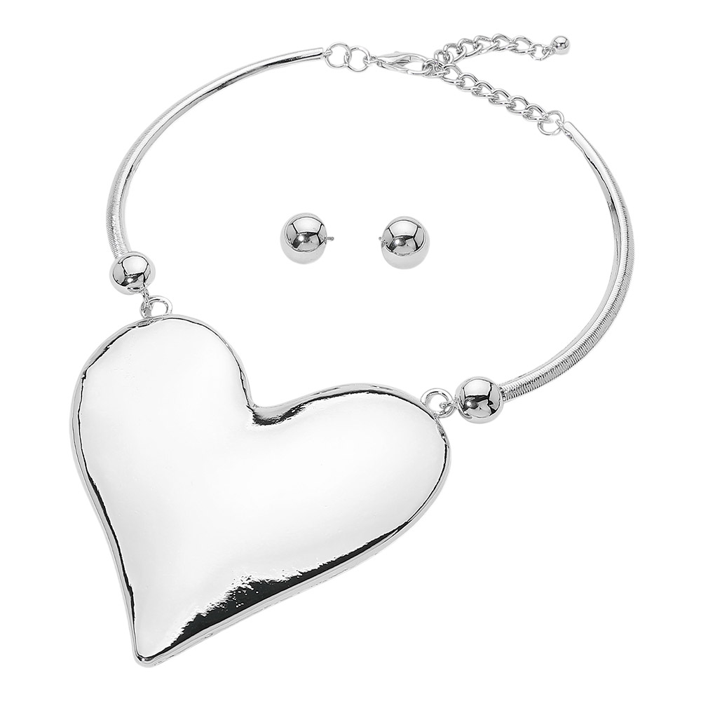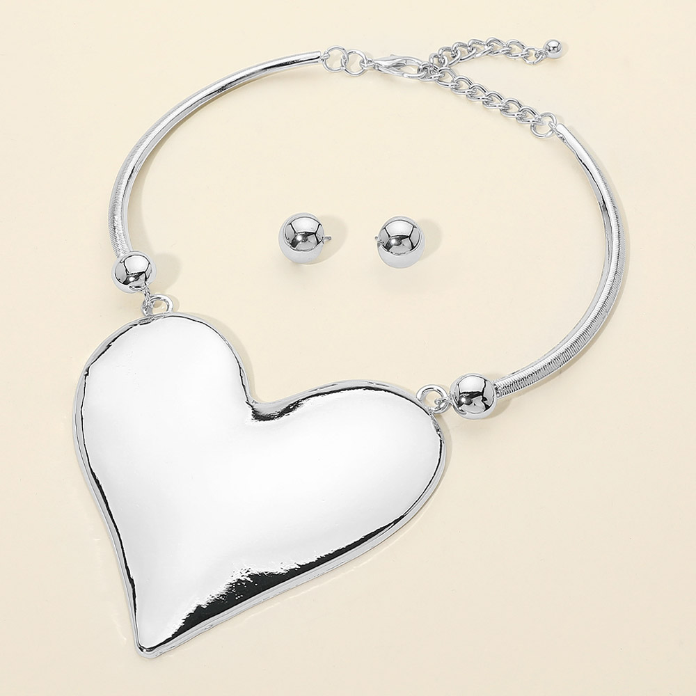 Details • Necklace Size : 14.5" + 3" L • Decor Size : 3.75" X 3.75" • Earrings Size : 0.6" L • Make a bold romantic statement with this oversized heart pendant necklace paired with simple stud earrings. Ideal for standout fashion moments, special occasions, or unique everyday style, this set adds a striking artistic touch that highlights your look with confident, eye-catching charm. • Lead and Nickel Compliant