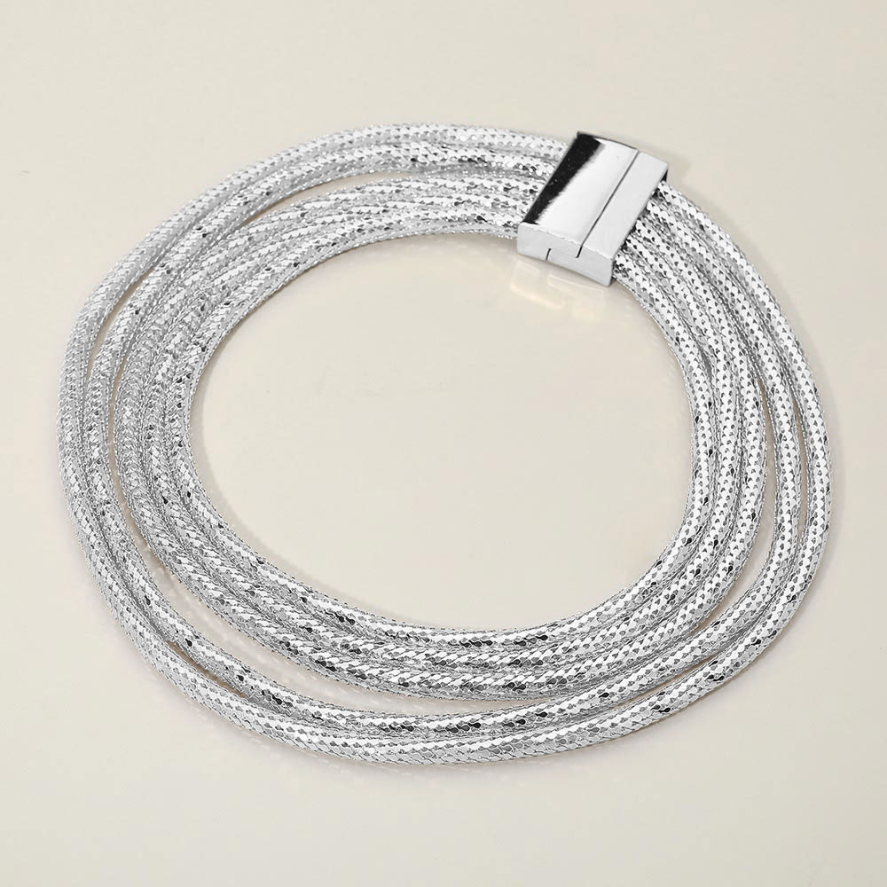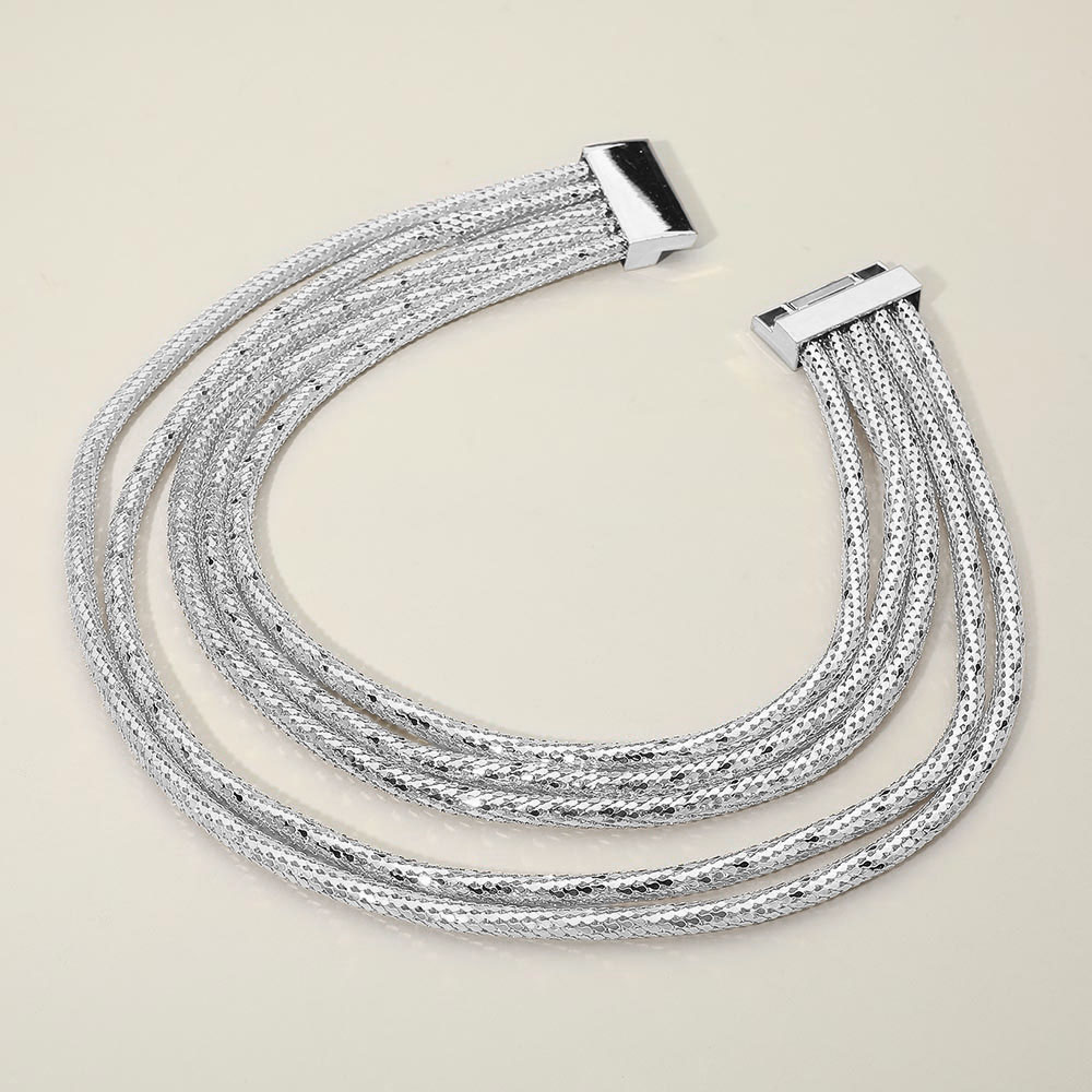 Details • Necklace Size : 20" L • Decor Size : 3.5" L • Magnetic Closure • Layered multi-strand textured chain necklace featuring shimmering woven strands and a sleek magnetic clasp. A bold yet versatile statement piece perfect for elevating casual or dressy outfits with a modern, polished finish. • Lead and Nickel Compliant