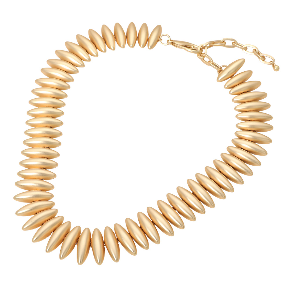 • This sculpted bead rib collar necklace delivers a modern statement with evenly spaced, smooth oval beads that create a bold yet refined silhouette. Designed to sit comfortably at the neckline, it elevates everyday outfits and complements dressier looks. An adjustable closure allows flexible styling, making this necklace ideal for layering or wearing alone as a standout piece in curated jewelry collections.