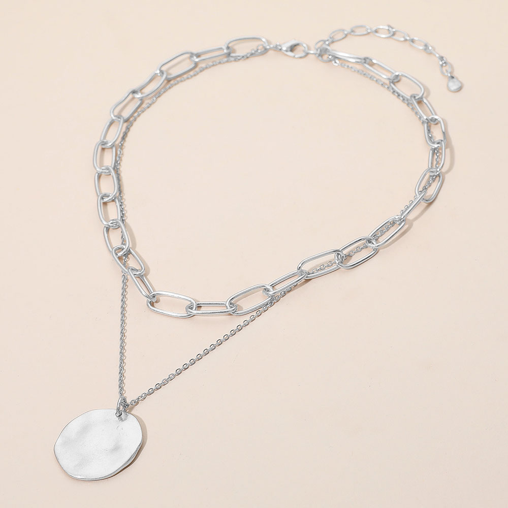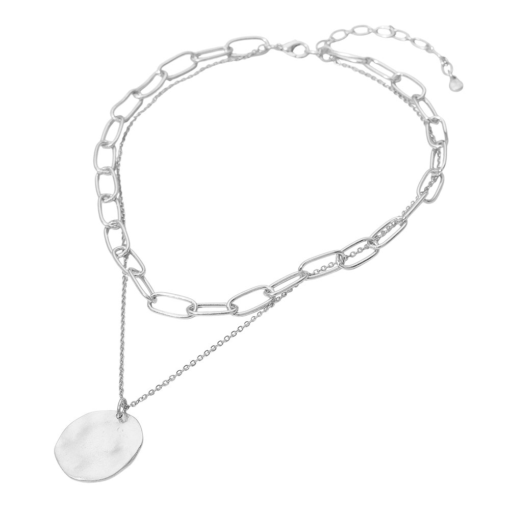 Details • Necklace Size : 14.5" + 3" L • Decor Size : 2.5" L • Modern layered chain necklace featuring bold link chains paired with a delicate chain and round pendant. A versatile accessory that blends edgy and elegant style, perfect for layering or wearing alone to enhance both casual and dressy outfits with a chic statement. • Lead and Nickel Compliant