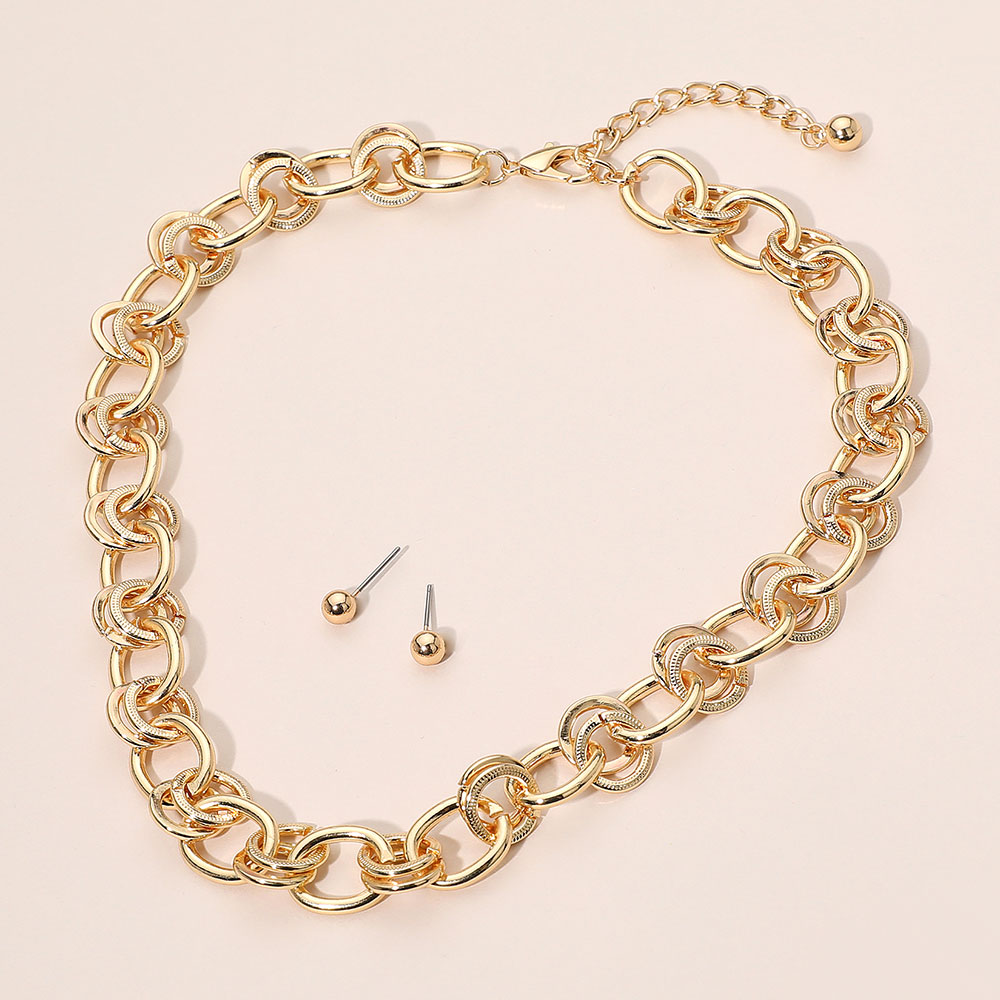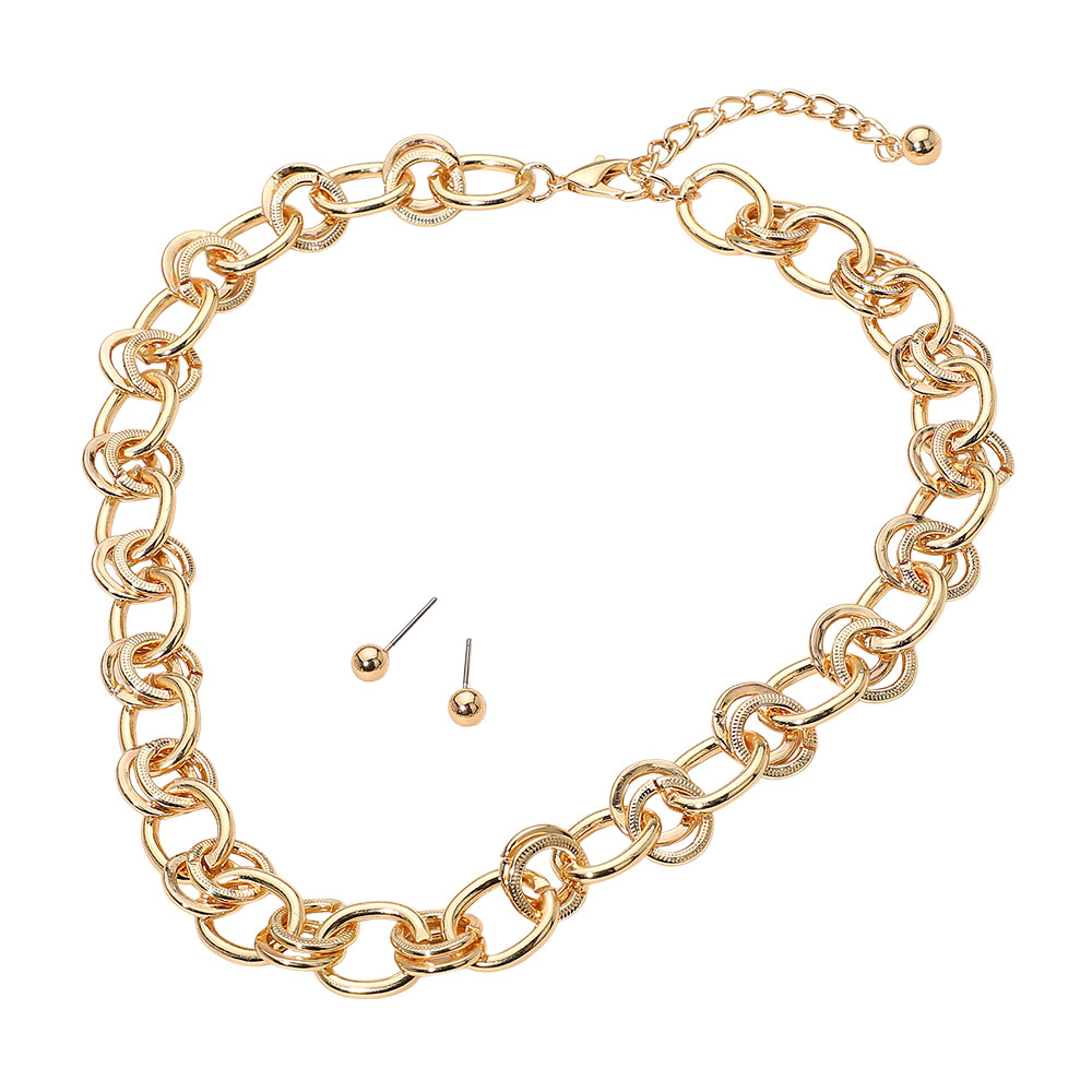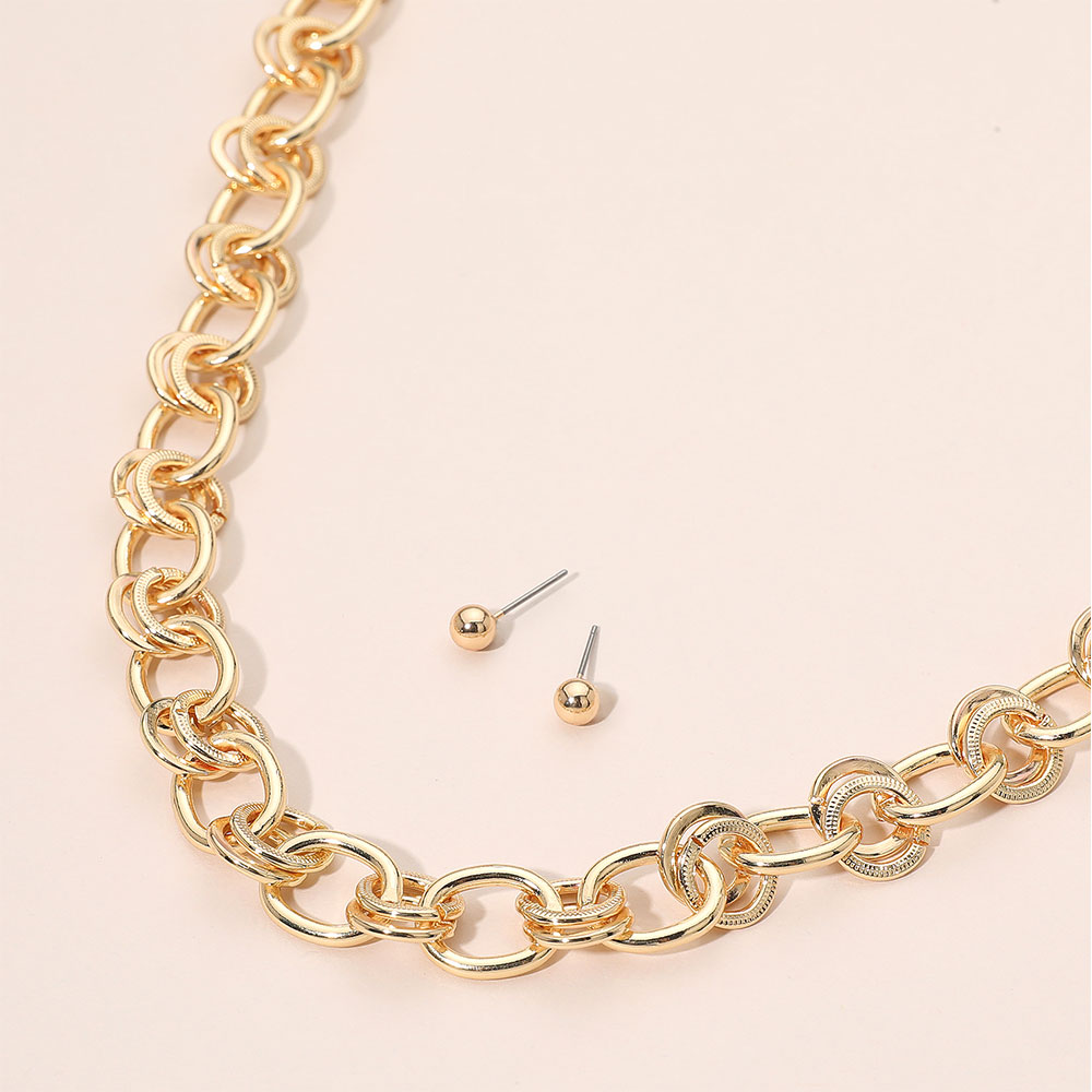• Elevate any outfit with this chunky link chain necklace paired with classic stud earrings. Designed for standout appeal, this versatile set adds a chic statement to casual and dressy looks, offering a polished finish that enhances your style with bold, modern elegance.