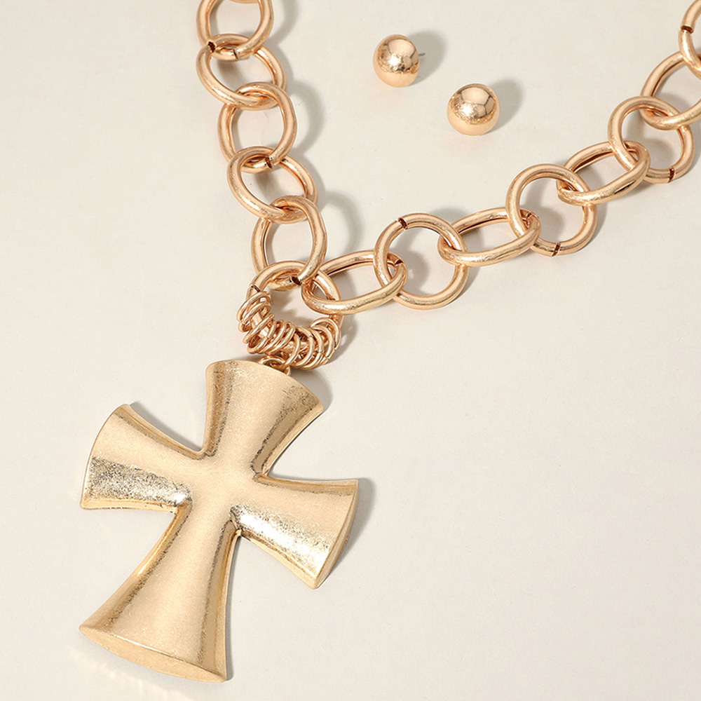 Details • Necklace Size : 20.5" + 3.25" L • Pendant Size : 2.5" X 3.25" • Earrings Size : 0.6" L • Make a statement with this striking cross pendant necklace paired with simple stud earrings. Featuring a chunky chain and bold pendant design, this set adds a touch of modern edge and elegance to any outfit, perfect for both casual and formal looks. • Lead and Nickel Compliant